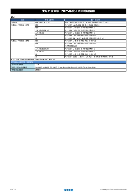主な私立大学2025年度入試の判明情報松山方式学部(学科)教科・科目等一般選抜共通テスト利用選抜(前期)共通テスト利用選抜(後期)経済、経営、人文、法経済経営人文(英語英米文)人文(社会)法薬経済経営人文(英語英米文)人文(社会)法薬個別:英・国(現)必須、数ⅠA・地公(地理・日・世・政)から1共テ:英RL必須、数2・国・理2・地公2・情から2共テ:英RL・国必須、数・理・地公・情から1共テ:英RL・国必須、数・理・地公・情から1共テ:英RL・国必須、数・理・地公・情から1共テ:英RL・数2・国・理2・地公2・情から3共テ:英R・数(A・C)必須、理(地基・地学を除く)から1共テ:英RL・数2・国・理2・地公2・情から3共テ:英RL・数2・国・理2・地公2・情から3※英か国を含むこと共テ:英RL・国必須、数・理・地公・情から1共テ:英RL・国必須、数・理・地公・情から1共テ:英RL・数2・国・理2・地公2・情から3共テ:英R・国から1、数(A・C)から1、理(地基・地学を除く)から1*2025年4月情報学部情報学科(仮称・設置構想中)新設予定個別試験の出題教科・科目の詳細「数学」の出題範囲「地歴・公民」の出題範囲「情報」の出題範囲Ⅰ・A「地理総合,地理探究」「歴史総合,日本史探究」「歴史総合,世界史探究」「公共,政治・経済」課さない124/129©KawaijukuEducationalInstitution.