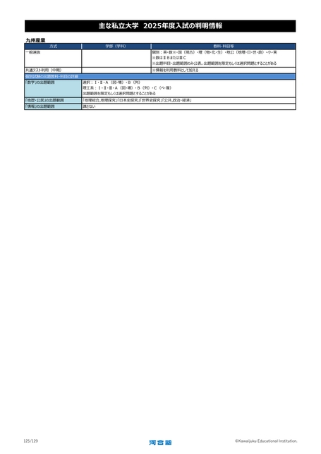 九州産業一般選抜方式共通テスト利用(中期)個別試験の出題教科・科目の詳細「数学」の出題範囲「地歴・公民」の出題範囲「情報」の出題範囲主な私立大学2025年度入試の判明情報学部(学科)教科・科目等個別:英・数※・国(現古)・理(物・化・生)・地公(地理・日・世・政)・小・実※数はⅡBまたはⅢC※出題科目・出題範囲のみ公表。出題範囲を限定もしくは選択問題とすることがある※情報を利用教科として加える選択:Ⅰ・Ⅱ・A(図・場)・B(列)理工系:Ⅰ・Ⅱ・Ⅲ・A(図・場)・B(列)・C(ベ・複)出題範囲を限定もしくは選択問題とすることがある「地理総合,地理探究」「日本史探究」「世界史探究」「公共,政治・経済」課さない125/129©KawaijukuEducationalInstitution.