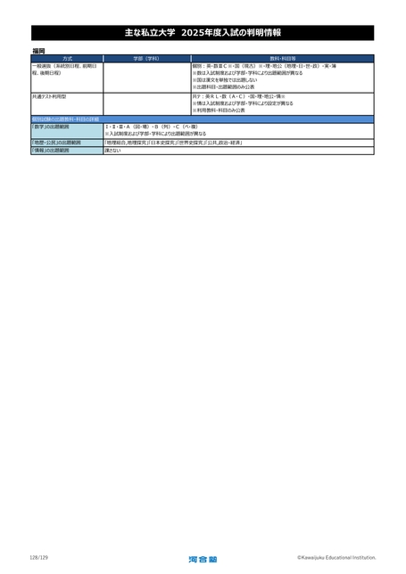 主な私立大学2025年度入試の判明情報福岡方式学部(学科)教科・科目等一般選抜(系統別日程、前期日程、後期日程)共通テスト利用型個別試験の出題教科・科目の詳細「数学」の出題範囲個別:英・数ⅢC※・国(現古)※・理・地公(地理・日・世・政)・実・簿※数は入試制度および学部・学科により出題範囲が異なる※国は漢文を単独では出題しない※出題科目・出題範囲のみ公表共テ:英RL・数(A・C)・国・理・地公・情※※情は入試制度および学部・学科により設定が異なる※利用教科・科目のみ公表Ⅰ・Ⅱ・Ⅲ・A(図・場)・B(列)・C(ベ・複)※入試制度および学部・学科により出題範囲が異なる「地歴・公民」の出題範囲「情報」の出題範囲「地理総合,地理探究」「日本史探究」「世界史探究」「公共,政治・経済」課さない128/129©KawaijukuEducationalInstitution.