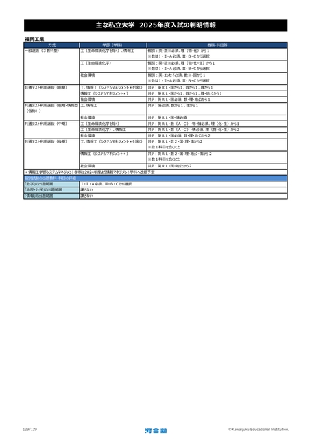 主な私立大学2025年度入試の判明情報福岡工業方式学部(学科)教科・科目等一般選抜(3教科型)工(生命環境化学を除く)、情報工工(生命環境化学)社会環境個別:英・数※必須、理(物・化)から1※数はⅠ・Ⅱ・A必須、Ⅲ・B・Cから選択個別:英・数※必須、理(物・化・生)から1※数はⅠ・Ⅱ・A必須、Ⅲ・B・Cから選択個別:英・エッセイ必須、数※・国から1※数はⅠ・Ⅱ・A必須、Ⅲ・B・Cから選択共通テスト利用選抜(前期)共通テスト利用選抜(前期・情報型(仮称))共通テスト利用選抜(中期)共通テスト利用選抜(後期)工、情報工(システムマネジメント*を除く)情報工(システムマネジメント*)社会環境工、情報工共テ:英RL・国から1、数から1、理から1共テ:英RL・国から1、数から1、理・地公から1共テ:英RL・国必須、数・理・地公から1共テ:情必須、数から1、理から1社会環境工(生命環境化学を除く)工(生命環境化学)、情報工社会環境工、情報工(システムマネジメント*を除く)共テ:英RL・国・情必須共テ:英RL・数(A・C)・物・情必須、理(化・生)から1共テ:英RL・数(A・C)・情必須、理(物・化・生)から2共テ:英RL・国必須、数・理・地公から2共テ:英RL・数2・国・理・情から2※数1科目を含むこと情報工(システムマネジメント*)社会環境共テ:英RL・数2・国・理・地公・情から2※数1科目を含むこと共テ:英RL・国・地公から2*情報工学部システムマネジメント学科は2024年度より情報マネジメント学科へ改組予定個別試験の出題教科・科目の詳細「数学」の出題範囲「地歴・公民」の出題範囲「情報」の出題範囲Ⅰ・Ⅱ・A必須、Ⅲ・B・Cから選択課さない課さない129/129©KawaijukuEducationalInstitution.