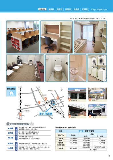 対象校舎本郷校麹町校新宿校池袋校秋葉原館TokyoHiyaku-ryo※定員に達し次第、締め切りますのでお早めにお申し込みください。A南口BコンビニA東十条駅Bコンビニ東十条駅前ホール郵便局交番CコンビニC郵便局至田端D十条駅京浜東北線東京飛躍寮篠原演芸場大東京信用組合大埼京線D北口十条駅至新宿寮周辺施設至赤羽至赤羽総合病院東十条駅河合塾専用寮の費用(税込)寮名男子寮東京飛躍寮支払方法一括払い入寮費分割手数料寮費管理費120,000円1,672,000円165,000円―支払額1,957,000円初回120,000円304,000円30,000円22,000円476,000円月払い月支払額―152,000円15,000円―167,000円×9回1,979,000円2JR京浜東北線・東京メトロ南北線で約20分後楽園駅4b出口から徒歩2分JR・東京メトロ南北線で約30分市ヶ谷駅3番出口から徒歩3分JR京浜東北線で約20分秋葉原駅昭和通り口から徒歩4分JR埼京線で約10分、新宿駅西口から徒歩3分JR埼京線で約5分、池袋駅メトロポリタン口から本館:徒歩3分西館:徒歩1分東十条駅から十条駅から本郷校麹町校秋葉原館新宿校池袋校最寄り駅から校舎まで