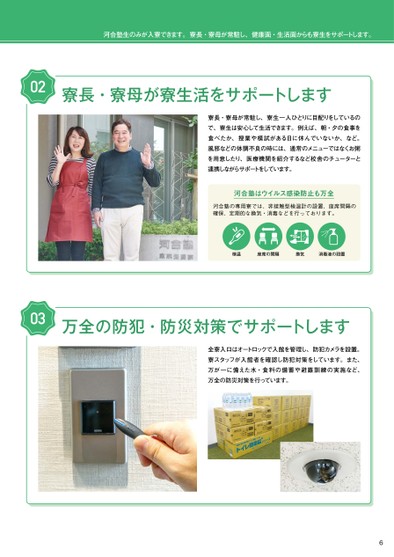 河合塾生のみが入寮できます。寮長・寮母が常駐し、健康面・生活面からも寮生をサポートします。02寮長・寮母が寮生活をサポートします寮長・寮母が常駐し、寮生一人ひとりに目配りをしているので、寮生は安心して生活できます。例えば、朝・夕の食事を食べたか、授業や模試がある日に休んでいないか、など。風邪などの体調不良の時には、通常のメニューではなくお粥を用意したり、医療機関を紹介するなど校舎のチューターと連携しながらサポートをしています。河合塾はウイルス感染防止も万全河合塾の専用寮では、非接触型検温計の設置、座席間隔の確保、定期的な換気・消毒などを行っております。検温座席の間隔換気消毒液の設置03万全の防犯・防災対策でサポートします全寮入口はオートロックで入館を管理し、防犯カメラを設置。寮スタッフが入館者を確認し防犯対策をしています。また、万が一に備えた水・食料の備蓄や避難訓練の実施など、万全の防災対策を行っています。6