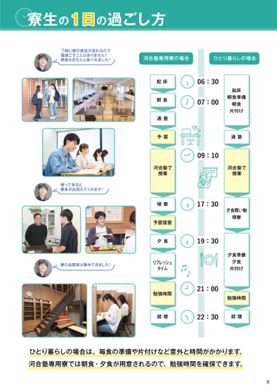 寮生の1日の過ごし方7時に朝の放送が流れるので寝過ごすことはありません!朝食もきちんと食べれました!河合塾専用寮の場合ひとり暮らしの場合起床朝食通塾予習河合塾で授業帰寮予習復習夕食リフレッシュタイム♫♪勉強時間就寝06:3007:0009:1017:3019:3021:00起床朝食準備朝食片付け通塾河合塾で授業夕食買い物帰寮夕食準備夕食片付け勉強時間22:30就寝帰って来ると寮長が出迎えてくれます!寮の自習室は集中できました!ひとり暮らしの場合は、毎食の準備や片付けなど意外と時間がかかります。河合塾専用寮では朝食・夕食が用意されるので、勉強時間を確保できます。8