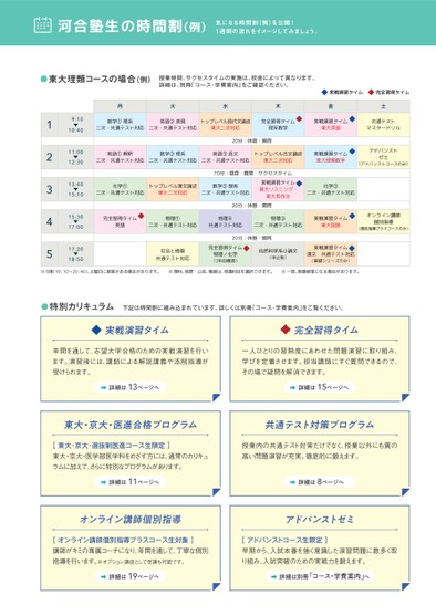 気になる時間割(例)を公開!1週間の流れをイメージしてみましょう。●東大理類コースの場合(例)授業時間、サクセスタイムの実施は、校舎によって異なります。詳細は、別冊「コース・学費案内」をご確認ください。123459:1010:4011:0012:3013:4015:1015:3017:0017:2018:50●特別カリキュラム下記は時間割に組み込まれています。詳しくは別冊「コース・学費案内」をご覧ください。実戦演習タイム完全習得タイム年間を通して、志望大学合格のための実戦演習を行います。演習後には、講師による解説講義や添削指導が受けられます。一人ひとりの習熟度にあわせた問題演習に取り組み、学びを定着させます。担当講師にすぐ質問できるので、その場で疑問を解消できます。詳細は13ページへ詳細は15ページへ東大・京大・医進合格プログラム共通テスト対策プログラム[東大・京大・選抜制医進コース生限定]東大・京大・医学部医学科をめざす方には、通常のカリキュラムに加えて、さらに特別なプログラムがあります。授業内の共通テスト対策だけでなく、授業以外にも質の高い問題演習が充実。徹底的に鍛えます。詳細は11ページへ詳細は8ページへオンライン講師個別指導アドバンストゼミ[オンライン講師個別指導プラスコース生対象][アドバンストコース生限定]講師がキミの専属コーチになり、年間を通して、丁寧な個別指導を行います。※オプション講座として受講も可能です。早期から、入試本番を強く意識した演習問題に数多く取り組み、入試突破のための実戦力を鍛えます。詳細は19ページへ詳細は別冊「コース・学費案内」へ
