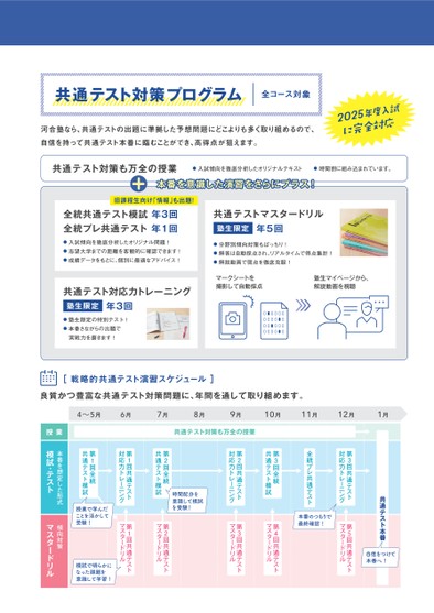 共通テスト対策プログラム全コース対象河合塾なら、共通テストの出題に準拠した予想問題にどこよりも多く取り組めるので、自信を持って共通テスト本番に臨むことができ、高得点が狙えます。共通テスト対策も万全の授業●入試傾向を徹底分析したオリジナルテキスト●時間割に組み込まれています。本番を意識した演習をさらにプラス!旧課程生向け「情報」も出題!全統共通テスト模試年3回全統プレ共通テスト年1回●入試傾向を徹底分析したオリジナル問題!●志望大学までの距離を客観的に確認できます!●成績データをもとに、個別に最適なアドバイス!共通テストマスタードリル塾生限定年5回●分野別傾向対策もばっちり!●解答は自動採点され、リアルタイムで得点集計!●解説動画で弱点を徹底克服!マークシートを撮影して自動採点塾生マイページから、解説動画を視聴共通テスト対応力トレーニング塾生限定年3回●塾生限定の特別テスト!●本番さながらの出題で実戦力を磨きます!4〜5月6月7月8月9月10月11月12月1月共通テスト対策も万全の授業共通テスト本番自信をつけて本番へ!第3回共通テスト対応力トレーニング第5回共通テストマスタードリル全統プレ共通テスト本番のつもりで最終確認!第3回全統共通テスト模試第4回共通テストマスタードリル第2回共通テスト対応力トレーニング第3回共通テストマスタードリル時間配分を意識して模試を受験!第2回全統共通テスト模試第2回共通テストマスタードリル第1回共通テスト対応力トレーニング第1回共通テストマスタードリル第1回全統共通テスト模試授業で学んだことを活かして受験!模試で明らかになった課題を意識して学習!授業本番を想定した形式模試・テスト傾向対策マスタードリル[戦略的共通テスト演習スケジュール]良質かつ豊富な共通テスト対策問題に、年間を通して取り組めます。