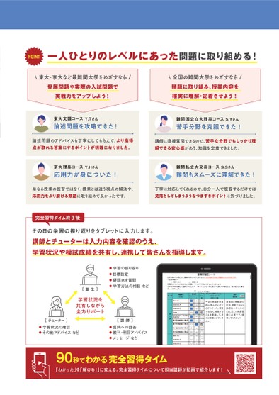 POINT一人ひとりのレベルにあった問題に取り組める!\東大・京大など最難関大学をめざすなら/発展問題や実際の入試問題で実戦力をアップしよう!\全国の難関大学をめざすなら/類題に取り組み、授業内容を確実に理解・定着させよう!東大文類コースY.Tさん論述問題を攻略できた!難関国公立大理系コースS.Yさん苦手分野を克服できた!論述問題のアドバイスも丁寧にしてもらえて、より高得点が取れる答案にするポイントが明確になりました。講師に直接質問できるので、苦手な分野でもしっかり理解できる安心感があり、知識を定着できました。京大理系コースY.Hさん応用力が身についた!難関私立大文系コースS.Sさん難問もスムーズに理解できた!単なる授業の復習ではなく、授業とは違う視点の解法や、応用力をより磨ける類題に取り組めて良かったです。丁寧に対応してくれるので、自分一人で復習するだけでは見落としてしまうようなつまずきポイントに気づけました。完全習得タイム終了後その日の学習の振り返りをタブレットに入力します。講師とチューターは入力内容を確認のうえ、学習状況や模試成績を共有し、連携して皆さんを指導します。●学習の振り返り●目標設定●疑問点を質問●学習方法の相談など[塾生]学習状況を共有しながら全力サポート[チューター]●学習状況の確認●その他アドバイスなど[講師]●質問への回答●教科・科目アドバイス●メッセージなど今まで英語を感覚的に読んでいたことがわかった。感覚ではなく、精読することを意識して、さらに得意にしていきたい。自動詞と他動詞の区別、感覚ではなく論理的に考えることは、正しい英語習得に必須です。頑張ってください!90秒でわかる完全習得タイム「わかった」を「解ける!」に変える。完全習得タイムについて担当講師が動画で紹介します!