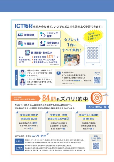ICT教材を組み合わせて、いつでもどこでも効率よく学習できます!授業動画学習記録リスニング音声河合塾One(A学習ツール)教材閲覧・書き込み●演習問題年間8,172ページ●解答・解説、リスニング音声●習得度確認シートすべて収録※例えば完全習得タイムだけでもタブレット1台にすべて集約!大学受験科生はタブレット端末の準備が必須です。河合塾では、ICT教材に対応したタブレット端末を特別価格でご案内します。詳しくはこちら※詳細は別途ご案内します。通塾の行き帰りに教材を広げずタブレットだけで確認でき、学習しやすいです。タグをつけて保存でき、タブレットにまとめて教材を管理できるので、振り返りやすいです。塾生の声※2023年度実績2023年度共通テスト・大学入試本番で84問もズバリ!的中共通テストはもちろん、国公立大二次試験や私立大入試において、河合塾のテキストや模試と同様の問題が、毎年多数出題されています。ズバリ!的中の一例東京大学世界史前期日程第2問論述問題の内容が的中!指定字数、設問条件までほぼ一致!京都大学数学3前期日程文系学部半径1の円に内接する正五角形の1辺の長さを求める手法が一致!共通テスト地理B第1問問5日本列島の震源の分布図を判断させる問題が一致!以下の科目・大学でズバリ!的中共通テスト英語(リーディング・リスニング)、数学ⅠA、数学ⅡB、現代文、古文、漢文、物理、物理基礎、化学、化学基礎、生物、生物基礎、地学基礎、日本史B、世界史B、地理B、現代社会、倫理、政治・経済二次試験・私立大入試東京大学、京都大学、北海道大学、北海道教育大学、東北大学、東京工業大学、名古屋大学、岐阜大学、大阪大学、神戸大学、鳥取大学、広島大学、九州大学、佐賀大学、早稲田大学、学習院大学、芝浦工業大学、上智大学、立教大学、同志社大学、立命館大学、関西大学、関西学院大学実際に的中した問題はWebサイトへ