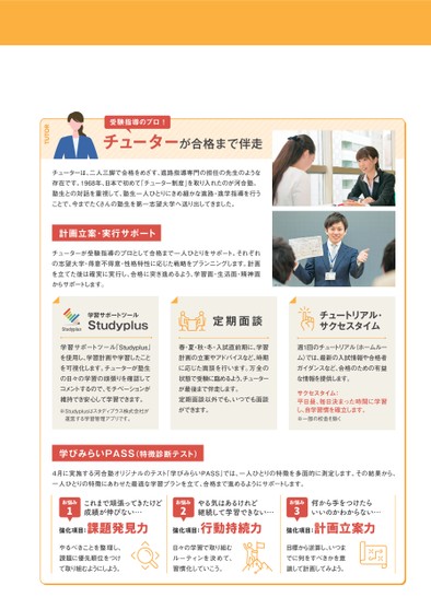 学習サポートツールStudyplus定期面談学習サポートツール「Studyplus」を使用し、学習計画や学習したことを可視化します。チューターが塾生の日々の学習の頑張りを確認してコメントするので、モチベーションが維持でき安心して学習できます。※Studyplusはスタディプラス株式会社が運営する学習管理アプリです。春・夏・秋・冬・入試直前期に、学習計画の立案やアドバイスなど、時期に応じた面談を行います。万全の状態で受験に臨めるよう、チューターが最後まで伴走します。定期面談以外でも、いつでも面談ができます。チュートリアル・サクセスタイム週1回のチュートリアル(ホームルーム)では、最新の入試情報や合格者ガイダンスなど、合格のための有益な情報を提供します。サクセスタイム:平日昼、毎日決まった時間に学習し、自学習慣を確立します。※一部の校舎を除く学びみらいPASS(特徴診断テスト)4月に実施する河合塾オリジナルのテスト「学びみらいPASS」では、一人ひとりの特徴を多面的に測定します。その結果から、一人ひとりの特徴にあわせた最適な学習プランを立て、合格まで進めるようにサポートします。受験指導のプロ!チューターが合格まで伴走TUTORチューターは、二人三脚で合格をめざす、進路指導専門の担任の先生のような存在です。1968年、日本で初めて「チューター制度」を取り入れたのが河合塾。塾生との対話を重視して、塾生一人ひとりにきめ細かな進路・進学指導を行うことで、今までたくさんの塾生を第一志望大学へ送り出してきました。計画立案・実行サポートチューターが受験指導のプロとして合格まで一人ひとりをサポート。それぞれの志望大学・得意不得意・性格特性に応じた戦略をプランニングします。計画を立てた後は確実に実行し、合格に突き進めるよう、学習面・生活面・精神面からサポートします。お悩み1これまで頑張ってきたけど成績が伸びない…強化項目:課題発見力お悩み2やる気はあるけれど継続して学習できない…強化項目:行動持続力お悩み3何から手をつけたらいいのかわからない…強化項目:計画立案力やるべきことを整理し、課題に優先順位をつけて取り組むようにしよう。日々の学習で取り組むルーティンを決めて、習慣化していこう。目標から逆算し、いつまでに何をすべきかを意識して計画してみよう。