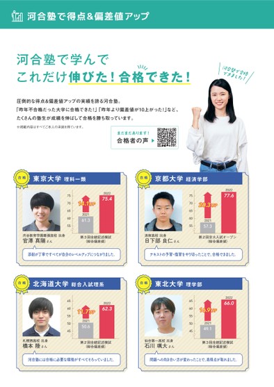 河合塾で学んでこれだけ伸びた!合格できた!圧倒的な得点&偏差値アップの実績を誇る河合塾。「昨年不合格だった大学に合格できた!」「昨年より偏差値が10上がった!」など、たくさんの塾生が成績を伸ばして合格を勝ち取っています。※掲載内容はすべてご本人の承諾を得ています。まだまだあります!合格者の声東京大学理科一類京都大学経済学部202275.4757065605514.1UP202161.3202277.6757065605520.3UP202157.3渋谷教育学園幕張高校出身官澤真陽さん第3回全統記述模試(総合偏差値)洛南高校出身日下部良仁さん第2回京大入試オープン(総合偏差値)添削が丁寧ですべてが自分のレベルアップにつながりました。テキストの予習・復習をやり切ったことで、合格できました。北海道大学総合入試理系東北大学理学部202262.3656055504511.7UP202150.6202266.0656055504516.9UP202149.1札幌西高校出身橋本陸さん第2回全統記述模試(総合偏差値)仙台第一高校出身石川颯大さん第3回全統記述模試(総合偏差値)河合塾には合格に必要な環境がすべてそろっていました。問題への向き合い方が変わったことで、高得点が取れました。