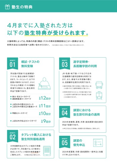 4月までに入塾された方は以下の塾生特典が受けられます。入塾時期によっては、特典の内容(模試・テストの無料受験回数など)が一部異なります。利用方法などは各校舎へお問い合わせください。※途中退塾された場合は、その時点で「塾生の特典」は無効となります。BENEFIT01模試・テストの無料受験BENEFIT03通学定期券・長距離学割の利用JR・私鉄・地下鉄・バスなどの公共交通機関の通学定期券を利用できます。また、帰省や大学受験の際には、長距離学生割引を利用できます。※通学定期券に関する詳細は、学費お支払い後にお届けする「入塾関係書類」をご覧ください。※特典を利用するためには、河合塾の塾生であることを証明する顔写真付きの「塾生証」が必要になる場合があります。BENEFIT04講習における塾生割引料金の適用2024年度春期、夏期、冬期・直前講習を塾生割引料金で受講できます。※申込方法などの詳細は、各講習の受付開始前にご案内します。BENEFIT05講習の優先申込2024年度夏期、冬期・直前講習を一般申込に先駆けて申し込みできます。12回分11回分10回分9回分年間年間年間年間河合塾が実施する全統模試・テストを、塾生は無料で受験できます。コースによって、以下の回数が無料になります。さらにそれ以上の模試・テスト受験を希望する場合にも、塾生割引料金で受験できます。●東大・京大コースすべて●選抜制医進コースすべて●上記以外の国公立大コース●上記以外の国公立大医進コース●早慶大コースすべて●上記以外の私立大コースすべてBENEFIT02タブレット購入における塾生特別価格適用大学受験科生はタブレット端末の準備が必須です。河合塾では、ICT教材に対応したタブレット端末を特別価格でご案内します。※詳細は別途ご案内します。