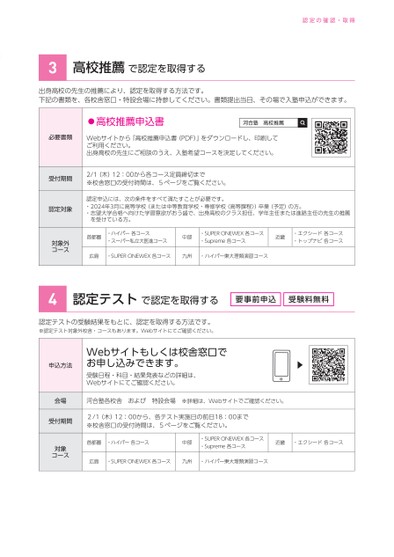 認定の確認・取得3高校推薦で認定を取得する出身高校の先生の推薦により、認定を取得する方法です。下記の書類を、各校舎窓口・特設会場に持参してください。書類提出当日、その場で入塾申込ができます。高校推薦申込書河合塾高校推薦必要書類Webサイトから「高校推薦申込書(PDF)」をダウンロードし、印刷してご利用ください。出身高校の先生にご相談のうえ、入塾希望コースを決定してください。受付期間2/1(木)12:00から各コース定員締切まで※校舎窓口の受付時間は、5ページをご覧ください。認定対象対象外コース認定申込には、次の条件をすべて満たすことが必要です。・2024年3月に高等学校(または中等教育学校・専修学校〈高等課程〉)卒業(予定)の方。・志望大学合格へ向けた学習意欲がおう盛で、出身高校のクラス担任、学年主任または進路主任の先生の推薦を受けている方。首都圏・ハイパー各コース・スーパー私立大医進コース中部・SUPERONEWEX各コース・Supreme各コース近畿・エクシード各コース・トップナビ各コース広島・SUPERONEWEX各コース九州・ハイパー東大理類演習コース4認定テストで認定を取得する要事前申込受験料無料認定テストの受験結果をもとに、認定を取得する方法です。※認定テスト対象外校舎・コースもあります。Webサイトにてご確認ください。申込方法Webサイトもしくは校舎窓口でお申し込みできます。受験日程・科目・結果発表などの詳細は、Webサイトにてご確認ください。会場河合塾各校舎および特設会場※詳細は、Webサイトでご確認ください。受付期間2/1(木)12:00から、各テスト実施日の前日18:00まで※校舎窓口の受付時間は、5ページをご覧ください。対象コース首都圏・ハイパー各コース中部・SUPERONEWEX各コース・Supreme各コース近畿・エクシード各コース広島・SUPERONEWEX各コース九州・ハイパー東大理類演習コース