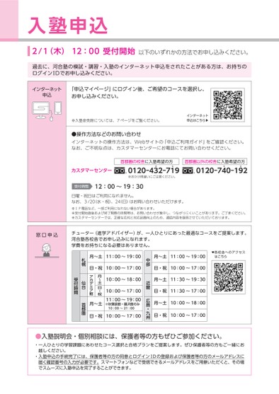 入塾申込2/1(木)12:00受付開始以下のいずれかの方法でお申し込みください。過去に、河合塾の模試・講習・入塾のインターネット申込をされたことがある方は、お持ちのログインⅠDでお申し込みください。インターネット申込「申込マイページ」にログイン後、ご希望のコースを選択し、お申し込みください。※入塾金免除については、7ページをご覧ください。インターネット申込はこちら▶●操作方法などのお問い合わせインターネットの操作方法は、Webサイトの「申込ご利用ガイド」をご確認ください。なお、ご不明な点は、カスタマーセンターにお電話にてお問い合わせください。カスタマーセンター首都圏の校舎に入塾希望の方首都圏以外の校舎に入塾希望の方0120-4342-7149※おかけ間違いにご注意ください。Ⓡ0120-7440-1942Ⓡ受付時間12:00〜19:30日曜・祝日はご利用になれません。なお、3/20(水・祝)、24(日)はお問い合わせいただけます。※ⅠP電話など、一部ご利用になれない場合があります。※受付開始直後および終了間際の時間帯は、お問い合わせが集中し、つながりにくいことがあります。ご了承ください。※カスタマーセンターでは、正確な応対と対応品質向上のため、通話内容を録音させていただいております。月〜土11:00〜19:00▶各校舎へのアクセスはこちら日・祝10:00〜17:00月〜土11:30〜19:30日・祝11:30〜17:00月〜土10:00〜18:00日・祝10:00〜17:00中部近畿広島・九州月〜土11:00〜19:00日・祝10:00〜17:0010:00〜18:0010:00〜17:0011:00〜19:00※秋葉原館・藤沢館のみ10:00〜21:00月〜土日・祝アカデミア館月〜土日・祝10:00〜17:00札幌仙台受付時間首都圏窓口申込チューター(進学アドバイザー)が、一人ひとりにあった最適なコースをご提案します。河合塾各校舎でお申し込みになれます。学費をお持ちになる必要はありません。●入塾説明会・個別相談には、保護者等の方もぜひご参加ください。・一人ひとりの学習課題にあわせたコース選択と合格プランをご提案します。ぜひ保護者等の方もご一緒にお越しください。・入塾申込の手続完了には、保護者等の方の同意とログインⅠDの登録および保護者等の方のメールアドレスに届く確認番号の入力が必要です。スマートフォンなどで受信できるメールアドレスをご用意いただくと、その場でスムーズに入塾申込を完了することができます。
