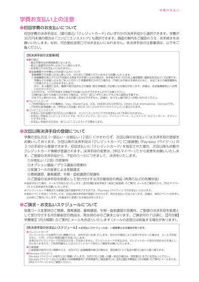 学費の支払い学費お支払い上の注意●初回学費のお支払いについて初回学費の決済手段は、「銀行振込」「クレジットカード」のいずれかの決済手段から選択できます。学費が30万円未満の場合は「コンビニエンスストア」も選択できます。画面の案内をご確認のうえ、お手続きをお願いいたします。なお、河合塾校舎窓口ではお支払いになれません。各決済手段の注意事項は、以下をご覧ください。【各決済手段の注意事項】●銀行振込・振込手数料はお客様負担となります。・振込口座番号はお申し込みごとに異なります。・校舎窓口ではお支払いになれません。■金融機関での学費などのお振り込みについて金融機関でのお振り込みに際しては、次の点にご留意くださいますようお願いいたします。①金融機関の窓口で10万円を超える現金でのお振り込みの場合は、お手続きを行う方の本人確認書類(運転免許証など)が必要です。学費などのお振り込みをご本人に代わって保護者等の方が行う場合は、円滑にお手続きを進めるために、生徒ご本人の確認書類もご用意されることをおすすめします。また、本人確認に加え、職業や取引目的などの確認(取引時確認)が必要となる場合があります。詳細は、各金融機関窓口へお問い合わせください。②ATMでは、10万円を超える現金でのお振り込みができませんのでご注意ください。③預貯金口座からお振り込みを行う場合は、ATM・窓口いずれにおいてもご本人確認は不要です。④ゆうちょ銀行からは、現金によるお振り込みができません。詳細は、ゆうちょ銀行窓口へお問い合わせください。●クレジットカード●コンビニエンスストア・ご利用可能なカードの種類は、Visa、MasterCard、JCB、AMERICANEXPRESS、DinersClubinternational、Discoverです。・ご利用代金明細書には、「学校法人河合塾」または「ガッコウホウジンカワイジュク」と表示されます。・お支払い合計金額が30万円以上の場合は、コンビニエンスストアでのお支払いはご利用になれません。・お支払い可能なコンビニエンスストアは、セブン-イレブン、ローソン、ファミリーマート、ミニストップ、セイコーマート、デイリーヤマザキです。・お支払い手続きの方法は、各コンビニエンスストアで異なります。●次回以降決済手段の登録について学費の支払方法[一括払い・分割払い(2回)]にかかわらず、次回以降のお支払いには決済手段の登録をお願いしております。次回以降の決済手段は「クレジットカード」「口座振替」「Pay-easy(ペイジー)」の3つの手段から登録できます。初回支払いに「クレジットカード」を指定された場合、次回以降も自動でクレジットカード情報が登録されます。決済手段の変更は、[申込マイページ]から変更をお願いいたします。ご登録の決済手段から、下記の①〜⑤につきまして、決済をいたします。①分割払い(2回)の授業料②オプション講座/プラス講座の授業料③受講コースの変更による差額請求④春期講習、夏期講習、冬期・直前講習の受講料⑤ご登録の決済手段を前提として受け付けする河合塾指定の商品(再発行などの各種料金)※返金が生じた場合、メールでお知らせいたします。[【河合塾】返金手続き(返金口座登録)のご案内]メールをご確認のうえ、[申込マイページ]からお手続きをお願いいたします。※クレジットカード情報または振替口座の登録が完了するまでは、「Pay-easy(ペイジー)」でのお支払いとなります。※有料イベント料金につきましては、次回以降決済手段の登録にかかわらず、別のお支払い方法となります。詳細は、有料イベントのお申し込み時にご案内いたします。(年度途中に変更になる場合があります。)●ご請求・お支払いスケジュールについて受講コース変更時のご精算、春期講習、夏期講習、冬期・直前講習の受講料、ご登録の決済手段を前提として受け付けする河合塾指定の商品は、発生時のみのご請求となります。ご請求月の7日頃に、[【河合塾】学費確定(月次精算)のご案内]メールをお送りいたします(メールの送信日は前後する場合があります)。【各決済手段のお支払いスケジュール】※お支払いスケジュールは、一部変更となる場合があります。●クレジットカード●口座振替●Pay-easy(ペイジー)クレジットカードは毎月5日に精算のうえ、当月8日に決済いたします。何らかの理由により決済できなかった場合は、メールでお知らせし、17日、27日に再度自動で決済いたします。決済日はクレジットカードの支払日と同一ではありません。クレジットカードの支払日は、クレジットカード会社が定める引き落とし日となりますので、ご利用明細もしくはクレジットカード会社にご確認をお願いいたします。口座振替は毎月5日に精算のうえ、当月27日(金融機関休業日の場合は、翌営業日)にご指定の銀行口座から振り替えます。Pay-easy(ペイジー)は毎月5日に精算いたします。当月27日(土曜・日曜・祝日の場合は、翌営業日)までにお支払いください。Pay-easy(ペイジー)払い