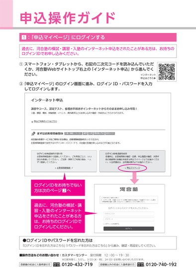 申込操作ガイド:「申込マイページ」にログインする過去に、河合塾の模試・講習・入塾のインターネット申込をされたことがある方は、お持ちのログインⅠDでお申し込みください。①スマートフォン・タブレットから、右記の二次元コードを読み込んでいただくか、河合塾Webサイトトップ右上の「インターネット申込」から進んでください。インターネット申込はこちら▶②「申込マイページ」のログイン画面に進み、ログインⅠD・パスワードを入力してログインします。ログインⅠDをお持ちでない方は次のページへ過去に、河合塾の模試・講習・入塾のインターネット申込をされたことがある方は、お持ちのログインⅠDでログインしてください。●ログインⅠDやパスワードを忘れた方は「ログインⅠDを忘れた方はこちら」「パスワードを忘れた方はこちら」から進み、確認・再設定してください。■操作方法などのお問い合わせ:カスタマーセンター受付時間12:00〜19:30※日祝を除く。ただし、3/20(水・祝)、24(日)はお問い合わせいただけます。首都圏の校舎に入塾希望の方Ⓡ0120-4342-7149首都圏以外の校舎に入塾希望の方Ⓡ0120-7440-1942