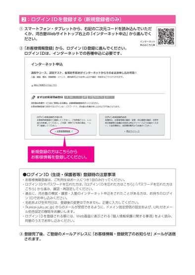 :ログインⅠDを登録する(新規登録者のみ)①スマートフォン・タブレットから、右記の二次元コードを読み込んでいただくか、河合塾Webサイトトップ右上の「インターネット申込」から進んでください。インターネット申込はこちら▶②「お客様情報登録」から、ログインⅠD登録に進んでください。ログインⅠDは、インターネットでの各種申込に必要です。新規登録の方はこちらからお客様情報を登録してください。●ログインⅠD(生徒・保護者等)登録時の注意事項・お客様情報登録は、ご利用生徒お一人につき1回のみ行ってください。・ログインⅠDやパスワードを忘れた方は、「ログインⅠDを忘れた方はこちら」「パスワードを忘れた方はこちら」から進み、確認・再設定してください。・過去に、河合塾の模試・講習・入塾のインターネット申込をされたことがある方は、お持ちのログインⅠDでお申し込みください。・名前および生年月日は、登録後の変更はできません。正確に入力してください。・「kawai-juku.ac.jp」からのメールが受信できるように、ドメイン指定受信の設定および、URL付きメー・ログインⅠDを登録される際には、Web画面に表示される「個人情報保護に関する事項」をよく読み、ル拒否設定の解除をお願いします。同意のうえでお申し込みください。③登録完了後、ご登録のメールアドレスに「お客様情報・登録完了のお知らせ」メールが送信されます。