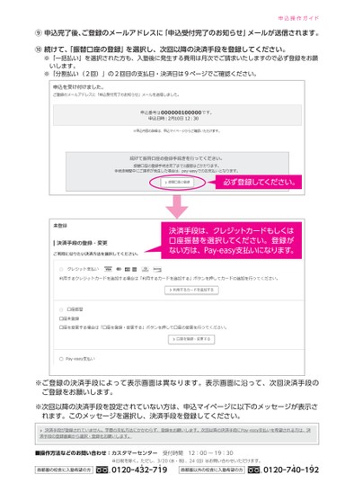 ⑨申込完了後、ご登録のメールアドレスに「申込受付完了のお知らせ」メールが送信されます。申込操作ガイド⑩続けて、「振替口座の登録」を選択し、次回以降の決済手段を登録してください。※「一括払い」を選択された方も、入塾後に発生する費用は月次でご請求いたしますので必ず登録をお願いします。※「分割払い(2回)」の2回目の支払日・決済日は9ページでご確認ください。必ず登録してください。決済手段は、クレジットカードもしくは口座振替を選択してください。登録がない方は、Pay-easy支払いになります。※ご登録の決済手段によって表示画面は異なります。表示画面に沿って、次回決済手段のご登録をお願いします。※次回以降の決済手段を設定されていない方は、申込マイページに以下のメッセージが表示されます。このメッセージを選択し、決済手段を登録してください。■操作方法などのお問い合わせ:カスタマーセンター受付時間12:00〜19:30※日祝を除く。ただし、3/20(水・祝)、24(日)はお問い合わせいただけます。首都圏の校舎に入塾希望の方Ⓡ0120-4342-7149首都圏以外の校舎に入塾希望の方Ⓡ0120-7440-1942