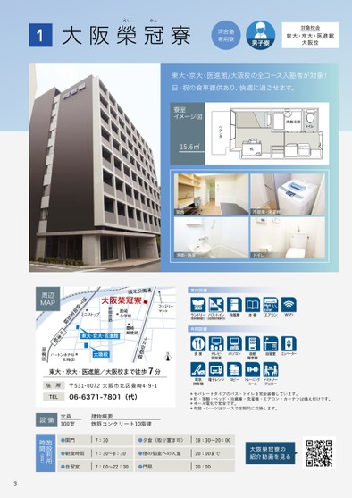 1えいかん大阪榮冠寮河合塾専用寮男子寮東大・京大・医進館対象校舎大阪校東大・京大・医進館/大阪校の全コース入塾者が対象!日・祝の食事提供あり、快適に過ごせます。洗面浴室洗面浴室トイレトイレ間取り図間取り図机机ベランダベランダ寮室イメージ図15.6㎡室内冷蔵庫・洗濯機洗面・浴室トイレ室内設備ランドリー(簡易乾燥機能付)バス・トイレ(浴室暖房乾燥機付き)冷蔵庫本棚エアコンWi-Fiファミリーマート城北公園通大阪榮冠寮豊崎小学校新御堂筋地下鉄御ミニストップ堂筋線周辺MAP共同設備N食堂テレビ・談話室パソコン自動販売機自習室エレベーター電気掃除機電子レンジコピートレーニングルームドミトリーフェロー*セパレートタイプのバス・トイレを完全装備しています。*机・本棚・ベッド・冷蔵庫・洗濯機・エアコン・カーテンは備え付けです。*オール電化で安全です。*布団・シーツはリースで定期的に交換します。東大・京大・医進館/大阪校まで徒歩7分住所〒531-0072大阪市北区豊崎4-9-1TEL06-6371-7801(代)豊崎郵便局JR京都線中津駅東大・京大・医進館大阪校ハートンホテル北梅田至梅田設備定員100室建物概要鉄筋コンクリート10階建大阪榮冠寮の紹介動画を見る●開門7:30●夕食(取り置き可)18:30〜20:00●朝食時間7:30〜8:30●他の個室への入室20:00まで●自習室7:00〜22:30●門限20:00施設利用時間(抜粋)3