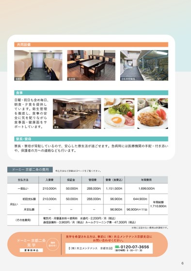 談話室自転車駐輪場共同設備自習室食事日曜・祝日も含め毎日、朝食・夕食を提供しています。衛生管理を徹底し、食事の安全に気を配りながら食事面・健康面をサポートしています。食堂寮長・寮母寮長・寮母が常駐しているので、安心した寮生活が過ごせます。急病時には医療機関の手配・付き添いや、保護者の方への連絡なども行います。ドーミー京都二条の費用申込方法など詳細は13ページをご覧ください。支払方法一括払い入寮費保証金管理費寮費(食費込)年間費用210,000円50,000円288,000円1,151,500円1,699,500円初回支払額210,000円50,000円288,000円96,900円644,900円月払い月支払額---96,900円96,900円×11回年間総額1,710,800円〈その他費用〉電気代…月額基本料+使用料水道代…2,200円/月(税込)通信設備料…3,960円/月(税込)ルームクリーニング費…47,300円(税込)ドーミー京都二条見学随時受付中!要事前申込見学を希望される方は、事前に(株)共立メンテナンス京都支店にお問い合わせください。※特に注記のない費用は非課税です。【(株)共立メンテナンス京都支店】0120-07-3656(受付時間)9:00〜17:306