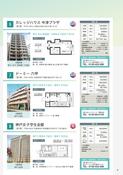 6カレッジハウス中津プラザ住所〒531-0071大阪府大阪市北区中津1-6-32男女東大·京大·医進館/大阪校まで徒歩で約3分寮室イメージ図12.5㎡〜13.7㎡設備概要対象校舎東大・京大・医進館/大阪校総戸数構造:74戸:鉄骨造(耐火構造)地上12階地下1階建78ドーミー六甲住所〒657-0024兵庫県神戸市灘区楠丘町5丁目5-14神戸三宮校まで徒歩・電車で約30分寮室イメージ図15.00㎡対象校舎神戸三宮校設備概要定員構造:46名:鉄筋コンクリート造5階建神戸女子学生会館住所〒658-0032兵庫県神戸市東灘区向洋町中7丁目1番6号男女女子寮神戸三宮校まで徒歩・電車で約35分寮室イメージ図19.97㎡〜28.78㎡設備概要対象校舎神戸三宮校総戸数構造:770戸:鉄骨鉄筋コンクリート造地上19階地下1階建費用一覧入寮費保証金管理費寮費(食費別)一括払い一括払い月払い月払い食費月払い150,000円50,000円8,800円29,800円〜47,800円33,770円(税込)………………………………<その他費用>24時間セキュリティー費損害保険料通信設備基本維持費電気・水道基本料電気・水道使用料は別途お支払いガス代5,000円/月9,500円/年……1,045円/月(税込)………2,178円/月(税込)………………………………………実費入寮申込・寮見学申込・お問い合わせ(株)毎日コムネット学生マンション総合案内センターTEL:0120-423-280費用一覧入寮費保証金管理費寮費(食費込)一括払い一括払い一括払い月払い一括払い190,000円50,000円300,000円89,100円〜99,100円1,059,000円〜1,177,500円<その他費用>電気代……………………ガス代水道代通信設備料………………………………………2,200円/月(税込)………………3,960円/月(税込)月額基本料+使用料ガス会社との直接契約入寮申込・寮見学申込・お問い合わせ(株)共立メンテナンス関西支店TEL:0120-80-5103費用一覧契約金一時金共益費寮費(食費別)ライフサポート費(食費含む)一括払い月払い月払い一括払い200,000円12,000円38,500円〜61,500円240,000円<その他費用>水道光熱費賃貸保証加入必須損害保険…………………………………実費…………………………9,000円/年入寮申込・寮見学申込・お問い合わせ(株)毎日コムネット学生マンション総合案内センターTEL:0120-423-2808