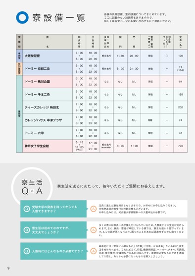 寮設備一覧各寮の共同設備、室内設備についてまとめています。ここに記載のない設備等もありますので、詳しくは各寮ページのお問い合わせ先にご連絡ください。定員(名)10017(134)641652027446770河合塾ドミトリーフェロー寮長・寮母(管理人)開門門限祝日・食事対応の朝夕あり7:3020:00常駐朝夕あり6:3021:30常駐なしなしなし常駐なしなしなし常駐なしなしなし常駐なしなしなし常駐なしなしなし常駐朝夕あり(年末年始除く)6:001:00常駐○ーーーーーーー夕食時間18:30〜20:0018:30〜22:3018:30〜22:3018:30〜22:3018:00〜22:0018:00〜23:0018:00〜22:0017:30〜21:30朝食時間7:30〜8:306:30〜8:306:30〜8:306:30〜8:307:00〜9:007:00〜8:307:00〜8:306:15〜10:00(平日)寮名大阪榮冠寮ドーミー京都二条ドーミー鴨川公園ドーミー千本二条ティーズカレッジ梅田北カレッジハウス中津プラザドーミー六甲神戸女子学生会館寮種類専用寮特別推薦寮推薦寮寮生活A&Q寮生活を送るにあたって、毎年いただくご質問にお答えします。Q受験大学の発表を待ってからでも入寮できますか?Q寮生活は初めてなのですが、大丈夫でしょうか?Q入寮時にはどんなものが必要ですか?AAA定員に達した寮は締切となりますので、お早めにお申し込みください。合格発表前の仮受付が可能な寮もございます。お申し込みには、河合塾大学受験科への入塾申込が必要です。多くの寮には家具一式が備え付けられているため、入寮後すぐに生活が始められます。また、寮長・寮母が常駐している寮では、寮生を温かく見守っています。もし体調が悪くなったり、困ったことがあれば遠慮せずに申し出てください。基本的には、勉強に必要なもの」「衣類」「洗面・入浴道具」さえあれば、寮生活を始められます。これに加えて、印鑑、健康保険証、ハンガー、タオル、常備薬、洗剤、懐中電灯、食器類などがあれば安心です。最低限必要なものだけを準備して入寮し、あとから必要になったものを購入しましょう。9