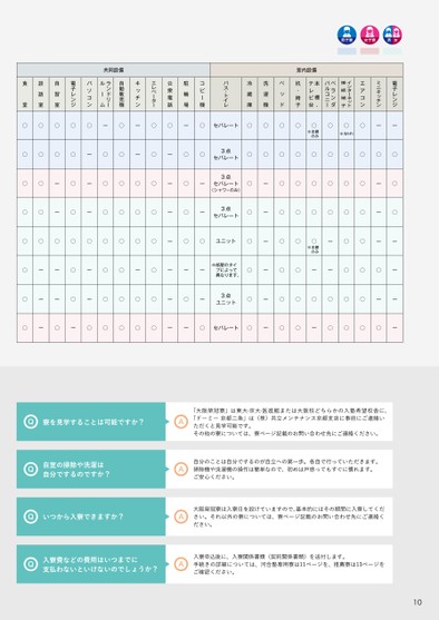 共同設備室内設備男子寮女子寮男女電子レンジミニキッチンエアコンインターネット接続端子ベランダバルコニー本棚・テレビ台机・椅子冷洗ベ蔵濯ッ庫機ドバス・トイレコピー機駐輪場公衆電話エレベーターキッチン自動販売機ランドリールームパソコン電子レンジ食談自話習堂室室○○○○○ー○ー○○ー○セパレート○○○○○※本棚のみ○○○ーー※Wi-Fi○○○○ー○○ー○ー○○3点セパレート○○○○○○○○○○○○ー○ー○○○○ー○ー3点セパレート(シャワーのみ)○ー○○○○○○ー○○○ー○ー○○○○ー○ー3点セパレート○ー○○○○○○ー○○○○○○○○○○ー○○ユニット○ー○○ー○○ーー○※本棚のみ○ーー○ー○○ー○ーーー○ーー○ー○○○○ー○ー※部屋のタイプによって異なります。3点ユニット○ー○○ーー○○○ー○ー○○○○○○ーー○ー○ー○○○○○ーー○セパレート○ー○○ー○○○○ーQ寮を見学することは可能ですか?Q自室の掃除や洗濯は自分でするのですか?Qいつから入寮できますか?Q入寮費などの費用はいつまでに支払わないといけないのでしょうか?AAAA「大阪榮冠寮」は東大·京大·医進館または大阪校どちらかの入塾希望校舎に、「ドーミー京都二条」は(株)共立メンテナンス京都支店に事前にご連絡いただくと見学可能です。その他の寮については、寮ページ記載のお問い合わせ先にご連絡ください。自分のことは自分でするのが自立への第一歩。各自で行っていただきます。掃除機や洗濯機の操作は簡単なので、初めは戸惑ってもすぐに慣れます。ご安心ください。大阪榮冠寮は入寮日を設けていますので、基本的にはその期間に入寮してください。それ以外の寮については、寮ページ記載のお問い合わせ先にご連絡ください。入寮申込後に、入寮関係書類(契約関係書類)を送付します。手続きの詳細については、河合塾専用寮は11ページを、推薦寮は13ページをご確認ください。10