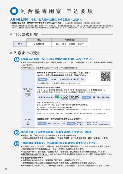 河合塾専用寮申込要項入塾申込と同時、もしくは入塾申込後にお申し込みください。◎定員に達し次第、締切ますのでお早めにお申し込みください。※入塾に関する詳細は別冊「入塾要項」をご覧ください。※共同生活が困難と思われる持病のある方、食物アレルギーのある方、一定の年齢を超える方などは、お申し込み後でも入寮をお断りさせていただく場合があります。入寮費などをお支払い済みの場合は退寮時期に応じた寮費を返金いたします。ご不明な点がございましたら、事前に校舎窓口までご確認ください。■河合塾専用寮男子寮名大阪榮冠寮入塾対象校舎東大・京大・医進館/大阪校■入寮までの流れ1入塾申込と同時、もしくは入塾申込後にお申し込みください。食物アレルギー疾患のある方は、事前に申請をしてください。申請内容によっては入寮をお断りする場合があります。入寮申込には、保護者等の方のメールアドレスの登録が必要です。Webサイト「申込マイページ」にログイン後、「入塾(講座・コース)・講習・寮を申し込む」からお申し込みください。受付期間2/1(木)12:00〜3/25(月)23:59受付期間終了後は、入塾希望校舎窓口にて受付いたします。インターネット申込●操作方法などのお問い合わせインターネット申込の操作方法は、Webサイトの「申込ご利用ガイド」をご確認ください。なお、ご不明な点は、カスタマーセンターにお電話にてお問い合わせください。カスタマーセンターⓇ740-192※おかけ間違いにご注意ください。受付時間12:00〜19:30日曜・祝日は受付を行いません。なお、3/20(水・祝)、3/24(日)はお問い合わせいただけます。※ⅠP電話など、一部ご利用になれない場合があります。※受付開始直後および終了間際の時間帯は、お問い合わせが集中し、つながりにくいことがあります。ご了承ください。※カスタマーセンターでは、正確な応対と、対応品質向上のため、通話内容を録音させていただいております。窓口申込河合塾各校舎いずれの校舎でもお申し込みできます。受付期間2/1(木)12:00〜受付時間月〜土11:30〜19:30日・祝11:30〜17:00※閉館日を除く23申込完了後、「入寮関係書類」をお受け取りください。(郵送)申込完了後、「申込受付完了のお知らせ」メールをお送りします。入塾と入寮の両方をお申し込みの場合、「入塾関係書類」と「入寮関係書類」は別々にお届けします。ご指定の決済手段で、支払期限日までに寮費をお支払いください。お支払い方法は「一括払い/月払い」、初回決済手段は「銀行振込/クレジットカード」を選択できます。初回寮費が30万円未満の場合は、「コンビニ支払」も選択いただけます。初回決済手段で「銀行振込」を選択されている場合は、振込期限日までに寮費をお支払いください。振込用紙の送付はございません。申込マイページの請求金額内訳よりお支払いに必要な情報をご確認ください。●合格発表をお待ちの方へ合格発表をお待ちの方は、決済手段「銀行振込」を選択してください。合格発表日まで振込期限日の延長を希望される場合は、入塾校舎までご連絡ください。大学合格などの理由により、入寮手続きが不要になった場合は、速やかに入塾校舎までご連絡ください。11