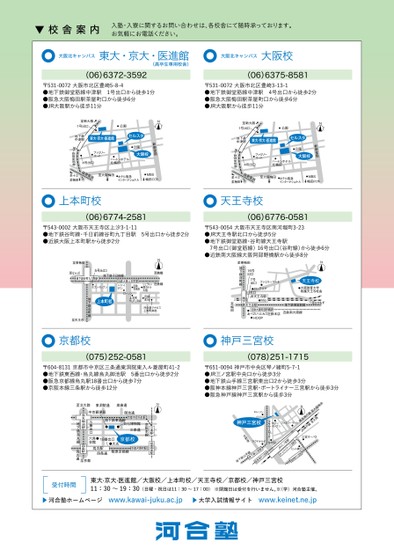 田梅阪阪大大線至線至戸戸神神ローソン●神戸三宮校●セブンイレブンファミリーマート●急阪JR北山鉄下地野坂マクドナルド●●なか卯手線地鉄下駅戸神宮急三阪駅宮三駅ーナ宮イノラ三ートJRポ三宮オーパ2●駅宮三ミント神戸●駅宮三戸神神阪新御堂筋公園大阪校ファミリーマート4号出口ハートンホテル北梅田阪急電鉄至大阪梅田ホテル阪急インターナショナルMBS梅田ロフト地下鉄御堂筋線至十三至梅田(06)6375-8581〒531-0072大阪市北区豊崎3-13-1●地下鉄御堂筋線中津駅4号出口から徒歩2分●阪急大阪梅田駅茶屋町口から徒歩6分●JR大阪駅から徒歩11分至新大阪1号出口公園N地下鉄中津駅東大・京大・医進館セルスタ天王寺校(06)6776-0581〒543-0054大阪市天王寺区南河堀町3-23●JR天王寺駅北口から徒歩5分●地下鉄御堂筋線・谷町線天王寺駅7号出口(御堂筋線)16号出口(谷町線)から徒歩6分●近鉄南大阪線大阪阿部野橋駅から徒歩8分至東梅田N天王寺校●大阪教育大学附属天王寺校舎至なかもず地下鉄御堂筋線近鉄南大阪線16号出口7号出口ファミリーマート●ロッテリア●北口JR天王寺駅Mio●天王寺駅近鉄大阪阿部野橋駅●あべのハルカス近鉄本店●HOOP線町谷鉄下地鉄下地至田梅神戸三宮校(078)251-1715〒651-0094神戸市中央区琴ノ緒町5-7-1●JR三ノ宮駅中央口から徒歩3分●地下鉄山手線三宮駅東出口2から徒歩3分●阪神本線神戸三宮駅・ポートライナー三宮駅から徒歩3分●阪急神戸線神戸三宮駅から徒歩3分新御堂筋公園大阪校ファミリーマート4号出口ハートンホテル北梅田阪急電鉄至大阪梅田ホテル阪急インターナショナルMBS梅田ロフト地下鉄御堂筋線至十三至梅田(06)6372-3592〒531-0072大阪市北区豊崎5-8-4●地下鉄御堂筋線中津駅1号出口から徒歩1分●阪急大阪梅田駅茶屋町口から徒歩6分●JR大阪駅から徒歩11分至新大阪1号出口公園N地下鉄中津駅東大・京大・医進館セルスタ上本町校(06)6774-2581〒543-0002大阪市天王寺区上汐3-1-11●地下鉄谷町線・千日前線谷町九丁目駅5号出口から徒歩2分●近鉄大阪上本町駅から徒歩2分N至鶴橋近鉄線シェラトン都ホテル大阪●●近鉄本社●河合塾マナビス上本町南校近鉄大阪上本町駅ハイハイ●近鉄タウン百貨店●ローソン●上本町YUFURA至東梅田至なんば5号出口地下鉄千日前線地下鉄谷町九丁目駅上本町校ブンイレブン●セ線町谷鉄下地至天王寺京都校(075)252-0581〒604-8131京都市中京区三条通東洞院東入ル菱屋町41-2●地下鉄東西線・烏丸線烏丸御池駅5番出口から徒歩2分●阪急京都線烏丸駅18番出口から徒歩7分●京阪本線三条駅から徒歩12分▼校舎案内入塾・入寮に関するお問い合わせは、各校舎にて随時承っております。お気軽にお電話ください。大阪北キャンパス東大・京大・医進館(高卒生専用校舎)大阪北キャンパス大阪校至北大路東洞院通高倉通NN東大·京大·医進館/大阪校/上本町校/天王寺校/京都校/神戸三宮校11:30〜19:30(日曜・祝日は11:30〜17:00)※閉館日は受付を行いません。※(学)河合塾主催。▶大学入試情報サイトwww.keinet.ne.jp▶河合塾ホームページwww.kawai-juku.ac.jp条三駅園祇条四駅線本阪京中京郵便局地下鉄東西線御池通京都市役所前駅文化博物館三条通18番出口京都校大丸烏丸駅四条通阪急京都線京都河原町駅5口出番六角会館池御丸烏駅条四駅至京都線丸烏鉄下地通丸烏受付時間