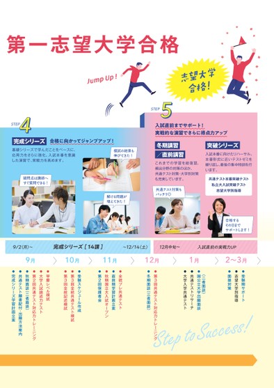 第一志望大学合格4STEP4完成シリーズ合格に向かってジャンプアップ!基礎シリーズで学んだことをベースに、応用力をさらに強化。入試本番を意識した演習で、実戦力を高めます。模試の結果も伸びてきた!疑問点は講師へすぐ質問できる!解ける問題が増えてきた!STEP55入試直前までサポート!実戦的な演習でさらに得点力アップ冬期講習/直前講習これまでの学習を総復習。頻出分野の対策のほか、共通テスト対策・大学別対策も充実しています。共通テスト対策もバッチリ◎突破シリーズ入試本番に向けたリハーサル。本番形式に近いテストゼミを繰り返し、最後の集中特訓を行います。共通テスト本番突破テスト私立大入試突破テスト志望大学別指導合格するその日までサポートします!9/2(月)〜完成シリーズ[14講]〜12/14(土)12月中旬〜入試直前の実戦力UP2〜3月●受験期サポート●志望大学別指導●面接対策1月(二者面談)●国公立大学出願面談●共通テストリサーチ●大学入学共通テストSteptoSuccess!12月●第3回共通テスト対応力トレーニング●冬期面談(三者面談)11月●全統プレ共通テスト●直前期学習計画立案●秋期国立大入試オープン●第2回保護者会10月●受験スケジュール作成●第3回全統共通テスト模試●第3回全統記述模試9月●早慶レベル模試●大学入試論述力テスト●第2回共通テスト対応力トレーニング●秋期面談(二者面談)●共通テスト願書配付・出願方法案内●完成シリーズ学習計画立案