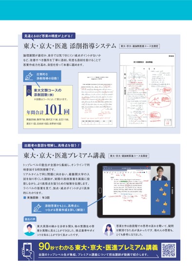 見違えるほど答案の精度が上がる!東大・京大・医進添削指導システム東大・京大・選抜制医進コース生限定論理展開が適切か、自分では気づきにくい減点ポイントがないかなど、改善すべき箇所を丁寧に添削。何度も添削を受けることで答案作成力を高め、自信を持って本番に臨めます。圧倒的な添削指導の回数!東大文類コースの添削回数(例)※回数はコースによって異なります。101101回回年間合計年間合計英語29回、数学7回、現代文11回、古文11回、漢文11回、日本史16回、世界史16回出題者の意図を理解し、高得点を狙う!東大・京大・医進プレミアム講義東大・京大・選抜制医進コース生限定トップレベルの塾生が全国から集結し、オンラインで同時参加する特別授業です。リアルタイムで同じ問題に向き合い、最難関大学の入試を知り尽くした講師が、実際の添削答案を画面に投影しながら、より高得点を狙うための秘策を伝授します。ライバルの答案を見て、加点・減点ポイントがより具体的にわかります。■実施回数:年3回添削答案をもとに、高得点につながる答案作成を詳しく解説!塾生の声東大英語の細かな分析を聞き、他の受講生の答案を実際に見ることができました。採点基準やポイントを知ることができて良かったです。答案を作る前段階での思考の流れを聞いて、疑問を解消できた点が良かったです。他の人の答案も、とても参考になりました。90秒でわかる東大・京大・医進プレミアム講義全国のトップレベル生が集結。プレミアム講義について担当講師が動画で紹介します。