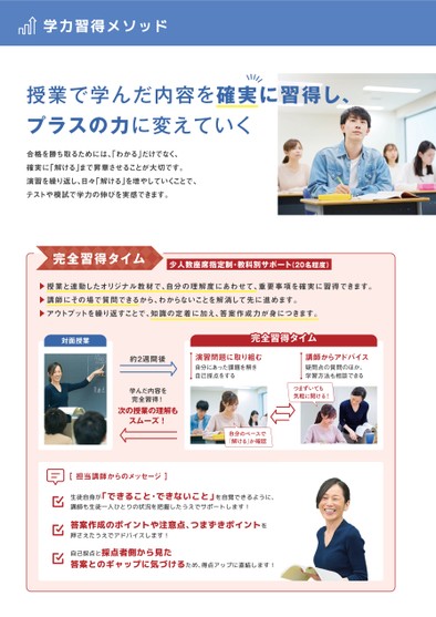 授業で学んだ内容を確実に習得し、プラスの力に変えていく合格を勝ち取るためには、わかる」だけでなく、確実に「解ける」まで昇華させることが大切です。演習を繰り返し、日々「解ける」を増やしていくことで、テストや模試で学力の伸びを実感できます。完全習得タイム少人数座席指定制・教科別サポート(20名程度)▲授業と連動したオリジナル教材で、自分の理解度にあわせて、重要事項を確実に習得できます。▲講師にその場で質問できるから、わからないことを解消して先に進めます。▲アウトプットを繰り返すことで、知識の定着に加え、答案作成力が身につきます。対面授業完全習得タイム約2週間後演習問題に取り組む自分にあった課題を解き自己採点をする講師からアドバイス疑問点の質問のほか、学習方法も相談できる学んだ内容を完全習得!次の授業の理解もスムーズ!つまずいても気軽に聞ける!自分のペースで「解ける」か確認[担当講師からのメッセージ]