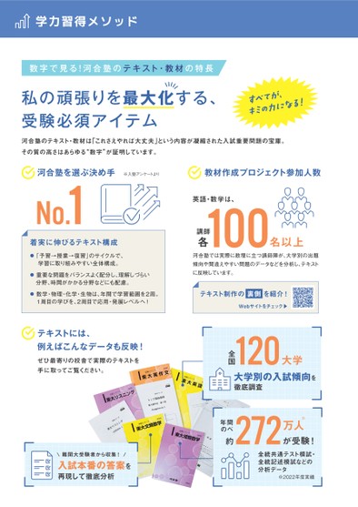 数字で見る!河合塾のテキスト・教材の特長私の頑張りを最大化する、受験必須アイテム河合塾のテキスト・教材は「これさえやれば大丈夫」という内容が凝縮された入試重要問題の宝庫。その質の高さはあらゆる“数字”が証明しています。※入塾アンケートより教材作成プロジェクト参加人数英語・数学は、100名以上講師各大学別の入試傾向を徹底調査大学120全国河合塾では実際に教壇に立つ講師陣が、大学別の出題傾向や間違えやすい問題のデータなどを分析し、テキストに反映しています。テキスト制作の裏側を紹介!Webサイトをチェック▶約272万人※年間のべが受験!河合塾を選ぶ決め手No.1着実に伸びるテキスト構成●「予習→授業→復習」のサイクルで、学習に取り組みやすい全体構成。●重要な問題をバランスよく配分し、理解しづらい分野、時間がかかる分野などにも配慮。●数学・物理・化学・生物は、年間で学習範囲を2周。1周目の学びを、2周目で応用・発展レベルへ!テキストには、例えばこんなデータも反映!ぜひ最寄りの校舎で実際のテキストを手に取ってご覧ください。\難関大受験者から収集!/入試本番の答案を再現して徹底分析全統共通テスト模試・全統記述模試などの分析データ※2022年度実績