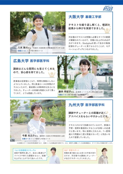 大阪大学基礎工学部テキストを繰り返し解くと、模試の結果から伸びを実感できました。河合塾のテキストは受験に必要なすべての範囲が網羅されているので、完璧に仕上げれば必ず力がつきます。Studyplusを使って自分の勉強記録をチューターに見てもらえたことが、モチベーションアップにつながりました。八木敦斗さん大阪府・大阪教育大学附属高校天王寺出身在籍コース:トップ阪大理系コース広島大学医学部医学科講師はどんな質問にも答えてくれるので、安心感を持てました。授業後は自習室にこもり、時間を無駄にしないようにしていました。同じ医進コースの仲間がクラスにいたので、直前期には精神的な支えになりました。チューターは些細な相談にもすぐ乗ってくれて、とても感謝しています。藤井早紀子さん広島県・ノートルダム清心高校出身在籍コース:ONEWEX国公立大医進コース九州大学医学部医学科講師やチューターとの距離が近く、アドバイスをもらいやすかったです。テキストがかなり洗練されているので、授業の予習・復習を徹底的にすることが合格への近道だと思います。特に復習に力を入れ、「一度間違えた問題は二度と間違えないぞ」と気合いを入れて復習していました。今里光之介さん福岡県・久留米大学附設高校出身在籍コース:トップ選抜九大医進コース※合格者はすべて2022年度在籍者であり、在籍コースは在籍当時の名称です。なお、本冊子に掲載している合格体験談は、すべてご本人の承諾を得ています。1to1合格戦略カリキュラム添削や質問を通して、自分に最適なアドバイスや新たな課題をもらい、成績を上げることができて良かったです。360°学習サポート受験を乗り越えるには多くの不安がありますが、河合塾では講師とチューターが全力でサポートしてくれました。