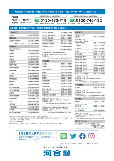 大学受験科の申込手続・学費についてのお問い合わせは、下記フリーダイヤルにご連絡ください。河合塾カスタマーセンター受付時間12:00〜19:30首都圏の校舎に入塾希望の方0120-43●2-71●9首都圏以外の校舎に入塾希望の方0120-74●0-19●2※日曜・祝日はご利用になれません。なお、3/20(水・祝)、24(日)はお問い合わせいただけます。入塾相談・受講相談については、下記の各校舎にお問い合わせください。(011)708-8581北海道地区札幌校東北地区(022)215-5111仙台校(大学受験科)(高校グリーンコース)(022)215-5112首都圏地区〈東大専門特化校舎〉本郷校麹町校新宿校池袋校秋葉原館*自由が丘校吉祥寺現役館*調布現役館*立川校町田校厚木現役館*藤沢館*横浜校あざみ野現役館*金沢文庫現役館*大宮校南浦和現役館*川越現役館*柏校津田沼校千葉現役館*水戸校MEPLO池袋教室*(03)5803-0581(03)3230-1581(03)3362-6581(03)3988-0581(03)5825-1581(03)5726-3261(0422)23-6581(042)440-2581(042)526-0581(042)724-7581(046)227-6581(0466)50-2581(045)312-6581(045)905-2581(045)782-7581(048)647-0581(048)884-7581(049)229-1005(04)7168-2271(047)473-7581(043)241-3581(029)302-6581(03)3988-6731MEPLO本郷教室MEPLO表参道教室*MEPLO横浜教室*COSMO東京校美術研究所新宿校海外帰国生コースK会(03)5803-0584(03)5778-9480(045)316-6581(03)5331-7581(03)3367-2581(03)3830-1371(03)3813-4581河合塾Wins(難関高校進学教室)*教室所在地・お問い合わせ先はWebサイトにてご確認ください。www.kawai-juku.ac.jp/wins/kanto/中部地区名駅校千種校星ヶ丘現役館*岐阜校浜松校豊橋校刈谷現役館*岡崎現役館*豊田現役館*四日市現役館*津現役館*美術研究所名古屋校(052)451-0581(052)735-1588(052)782-0581(058)264-5581(053)453-5581(0532)54-0581(0566)21-3581(0564)54-3581(0565)32-5581(059)350-4581(059)226-0581(052)735-1596小学・中学グリーンコース教室所在地・お問い合わせ先はWebサイトにてご確認ください。www.kawai-juku.ac.jp/jhreen/tokai/河合塾Wins(難関公立高校進学教室)*教室所在地・お問い合わせ先はWebサイトにてご確認ください。www.kawai-juku.ac.jp/wins/tokai/※(学)河合塾主催。*の校舎は(株)河合塾進学研究社主催の校舎です。河合塾マナビス各校舎の主催者は、各校舎へ直接お電話などでお問い合わせいただくか、河合塾マナビスのWebサイトでご確認ください。※「現役館」は登録商標です。※おかけ間違いにご注意ください。ⅠP電話など、一部ご利用になれない場合があります。近畿地区大阪北キャンパス大阪校大阪北キャンパス東大・京大・医進館(高卒生専用校舎)上本町校天王寺校京都校神戸三宮校現役生教室豊中*現役生教室高槻*現役生教室堺東*現役生教室岸和田*現役生教室西大寺*現役生教室八木*サポートコース梅田(06)6375-8581(06)6372-3592(06)6774-2581(06)6776-0581(075)252-0581(078)251-1715(06)6842-3581(072)686-6788(072)225-6072(072)436-8581(0742)30-0581(0744)29-3581(06)6372-5124中学グリーンコース校舎所在地・お問い合わせ先はWebサイトにてご確認ください。www.kawai-juku.ac.jp/jhreen/kinki/中四国地区広島校(082)263-8581中学グリーンコース校舎所在地・お問い合わせ先はWebサイトにてご確認ください。www.kawai-juku.ac.jp/jhreen/hiroshima/九州地区福岡校2024年3月31日まで北九州校2024年4月1日から北九州現役館*(092)714-0581(093)581-2581(093)330-6581中学グリーンコース校舎所在地・お問い合わせ先はWebサイトにてご確認ください。www.kawai-juku.ac.jp/jhreen/fukuoka/河合塾マナビス校舎所在地はWebサイトにてご確認ください。www.manavis.com/(03)3512-5771最新の教育情報やイベントのご案内など、随時発信してまいります。※2023年7月23日時点の正式名称・ロゴで掲載しております。