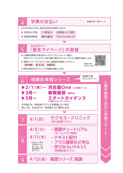 STEP4学費の支払い詳細は7〜11ページ以下のお支払い方法・初回決済手段が選択できます。▶お支払い方法▶初回決済手段一括払い銀行振込分割払い(2回)クレジットカードSTEP5塾生専用サイト「塾生マイページ」の登録▶入塾関係書類をお受け取りください(ダウンロード・郵送)。「申込マイページ」にログイン後、「各種ご案内ダウンロード」からご確認をお願いします。▶「塾生マイページ」にログイン後、必要項目を登録してください。基本情報顔写真受講科目▶学習に使用するタブレットの準備をお願いします。手続完了後の流れはこちら▶入塾手続完了日から学習スタート!手続完了後すぐにスタート!開講前準備シリーズSTEP6▶2/1(木)〜河合塾One(AⅠ学習ツール)▶3月〜▶3月〜春期講習(要申込)スタートガイダンス(入塾オリエンテーション)その他にも、各校舎でイベントを実施しています。詳しくは、Webサイト・各校舎にてご案内します。STEP7STEP8STEP94/1(月)サクセス・クリニック(学力診断テスト)4/9(火)4/11(木)〜※校舎により実施日が異なります。詳しくは、入塾関係書類をご確認ください。(ホームクラス発表)・開講チュートリアル・テキスト配付・プラス講座など申込・学びみらいPASS(特徴診断テスト)4/12(金)基礎シリーズ開講