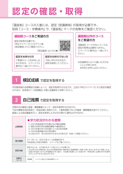 認定の確認・取得「選抜制」コースの入塾には、認定(受講資格)の取得が必要です。別冊「コース・学費案内」で、「選抜制」マークの有無をご確認ください。選抜制コースをご希望の方認定の取得が必要です。「申込マイページ」にログイン後、「認定確認」からご確認ください。「認定確認」はこちら▶認定をお持ちの方ご希望のコースをお申し込みできます。5ページ「入塾申込」へ進んでください。認定をお持ちでない方下記いずれかの方法で、認定を取得してください。1模試成績で認定を取得する選抜制以外のコースをご希望の方「選抜制」マークがないコースは、認定の取得は必要ありません。5ページ「入塾申込」へ進んでください。※定員締切により入塾いただけないことがあります。お早めにお申し込みください。河合塾実施の全統模試の成績によって、認定を取得する方法です。上記の「申込マイページ」から認定を確認されるか、校舎窓口へ「全統模試」の個人成績表をご持参ください。2自己推薦で認定を取得する学習状況の確認と面接・書類審査によって、認定を取得する方法です。下記の書類を各校舎窓口・特設会場に持参のうえ、入塾希望者ご本人が面接・書類審査を受けてください。面接による認定審査を行い、認定を取得した方はその場で入塾申込ができます。学力状況がわかる書類必要書類⑴2023年度実施の河合塾以外の模試成績表⑵高校3年時の校内試験成績表や通知表など⑶2024年度大学入学共通テスト自己採点結果⑷2024年度受験大学の得点開示※上記以外で、学力状況がわかるものがあれば、校舎へご相談ください。受付期間2/1(木)12:00から各コース定員締切まで※校舎窓口の受付時間は、5ページをご覧ください。認定申込には、次の条件をすべて満たすことが必要です。・・2024年3月に高等学校(または中等教育学校・専修学校〈高等課程〉)卒業(予定)あるいはすでに卒業した方。志望大学合格へ向けた学習意欲がおう盛で、河合塾の指導により志望大学・学部合格に必要な学力を習得することができると見込まれる方。首都圏・ハイパー国公立大医進演習コース認定対象対象外コース
