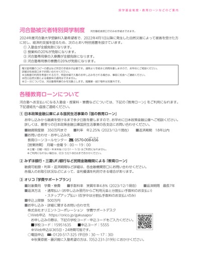 奨学基金制度・教育ローンなどのご案内河合塾被災者特別奨学制度河合塾校舎窓口でのみお手続きできます。2024年度河合塾大学受験科入塾希望者で、2022年4月1日以降に発生した自然災害によって被害を受けた方に対し、経済的支援を図るため、次のとおり特別措置を設けています。①入塾金が全額免除になります。②授業料の20%が免除になります。③河合塾専用寮の入寮費が全額免除になります。④河合塾専用寮の寮費の20%が免除になります。罹災証明書のコピーの提出など所定の手続きが必要です。通常より手続きに時間を要しますので、お早めにご相談ください。詳細は校舎窓口までお問い合わせください。※当制度の利用を希望される方で、特設会場で入塾のお申し込みをされる場合は、事前に校舎へご連絡ください。※同じ自然災害による複数年の適用はできません。※③・④については、河合塾専用寮のみを対象とします。推薦寮・紹介物件は対象外です。各種教育ローンについて河合塾へお支払いになる入塾金・授業料・寮費などについては、下記の「教育ローン」をご利用になれます。下記連絡先へ直接ご連絡ください。日本政策金融公庫による国民生活事業の「国の教育ローン」お申し込みから融資を受けるまで多少日数を要しますので、お早めに日本政策金融公庫へご相談ください。詳しくは、最寄りの日本政策金融公庫国民生活事業の各支店にお問い合わせください。■融資限度額350万円まで■利率年2.25%(2023/12/1現在)■返済期間18年以内■お問い合わせ・お申し込み先教育ローンコールセンター[営業時間]月曜〜金曜9:00〜19:000570-008-656※土曜・日曜・祝日・年末年始(12/31〜1/3)はご利用になれません。※ご利用になれない場合は、(03)5321-8656までおかけください。みずほ銀行・三菱UFJ銀行など民間金融機関による「教育ローン」融資可能額・利率・返済期間など詳細は、各金融機関窓口にお問い合わせください。各個人のお取引状況などによって、金利優遇を利用できる場合があります。オリコ「学費サポートプラン」■対象費用学費・寮費■手数料率実質年率4.8%(2023/12/1現在)■返済期間最長7年■返済方法・通常払い(お申し込み翌月からご利用元金と分割払い手数料のお支払い)・ステップアップ払い(在学中は分割払手数料のお支払いのみ)■申込上限額500万円■お申し込み・詳細に関するお問い合わせ先株式会社オリエントコーポレーション学費サポートデスク○Web申込https://orico.jp/gakusapo/お申し込みの際は、下記の学校コード・申込コードをご入力ください。■学校コード:15951635■申込コード:5555※Web申込は365日・24時間可能です。○電話申込※秋葉原館・藤沢館に入塾希望の方は、「052-231-3199」におかけください。®0120-517-325(平日9:30〜17:30)