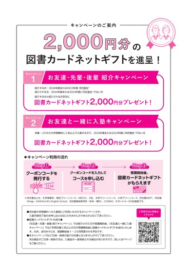 キャンペーンのご案内2,000円分の図書カードネットギフトを進呈!キャンペーン1お友達・先輩・後輩紹介キャンペーン紹介する方:2024年度または2023年度河合塾生※紹介される方:2024年度または2023年度に河合塾生※でない方紹介する方と紹介される方双方に図書カードネットギフト2,000円分プレゼント!キャンペーン2お友達と一緒に入塾キャンペーン対象:これから大学受験科に2名以上で入塾する方で、2024年度または2023年度に河合塾生※でない方図書カードネットギフト2,000円分プレゼント!キャンペーン利用の流れStep❶クーポンコードを発行する1234Step❷クーポンコードを入力してコースを申し込む申し込み1234Step❸受講開始後、図書カードネットギフトがもらえます※河合塾生とは、大学受験科、高校グリーンコース、MEPLO、K会、中学グリーンコース、小学グリーンコース、河合塾NEXT、河合塾Wings、KAWAIJUKUEnglishSchool、河合塾美術研究所(本科・専科)、COSMO、サポートコースの在籍者です。●河合塾大学受験科への入塾時にご利用いただけるキャンペーンです。入塾手続完了後のお申し出には応じられませんのであらかじめご了承ください。◆図書カードネットギフトの送付◆「お友達・先輩・後輩紹介キャンペーン」では紹介された方が受講開始後、「お友達と一緒に入塾キャンペーン」ではご利用対象2名以上の方が受講開始後に図書カードネットギフトを送付いたします。なお、送付までには、受講開始後1〜2カ月程度かかる予定です。●本キャンペーンではご兄弟・姉妹の紹介は対象となりませんのでご了承ください。河合塾生のご兄弟・姉妹の方は、入塾金が一部免除される場合がありますので、詳しくは7ページをご覧ください。ご利用方法の詳細はこちらから