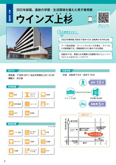 紹介ページはコチラ!2023年新築。最新の学習・生活環境を備えた男子専用寮ぎウインズ上かみ杉す男子 専用寮ここがポイント!2023年春新築。校舎まで徒歩10分、自転車5分の好立地。ブース型自習室/ラーニングコモンズを備え、ライバルと切磋琢磨でき、受験勉強だけに集中できる環境。全館Wi-Fi化、寮室には冷蔵庫と洗濯機がありユニットバスとトイレはセパレートタイプ。交通手段◦交通自転車で5分・徒歩で10分WinsKamisugiDATA◦所在地〒980-0011仙台市青葉区上杉1-8-26◦間取り約9畳共用設備食堂食堂ラーニングラーニングコモンズコモンズスペーススペース自習室自習室ウインズ上杉飲料自販機飲料自販機エレベーターエレベーターコピーコピーWi-FiWi-Fi駐輪場駐輪場近隣MAP徒歩10分河合塾仙台校自転車5分寮室設備※ベランダ付ベッド・寝具ベッド・寝具机・椅子・机・椅子・スタンドスタンド本棚本棚クローゼットクローゼット冷暖房冷暖房洗濯機洗濯機冷蔵庫冷蔵庫ユニットバスユニットバス(トイレ別)(トイレ別)Wi-FiWi-Fi3宮城中央病院おいで薬局上杉山通小学校〈指定避難所〉ウインズ上杉