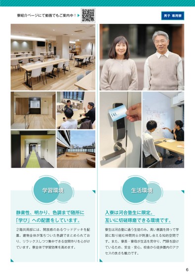 寮紹介ページにて動画でもご案内中!▲男子 専用寮学習環境生活環境静粛性、明かり、色調まで随所に「学び」への配置をしています。入寮は河合塾生に限定。互いに切磋琢磨できる環境です。2階共用部には、開放感のあるウッドデッキを配寮生は河合塾に通う生徒のみ。高い意識を持って学置。建物全体が落ちついた色調でまとめられてお習に取り組む仲間同士が刺激し合える知的空間でり、リラックスしつつ集中できる空間作りを心がけす。また、寮長・寮母が生活を見守り、門限を設けています。寮全体で学習効果を高めます。ているため、安全・安心。校舎から徒歩圏内のアクセスの良さも魅力です。6