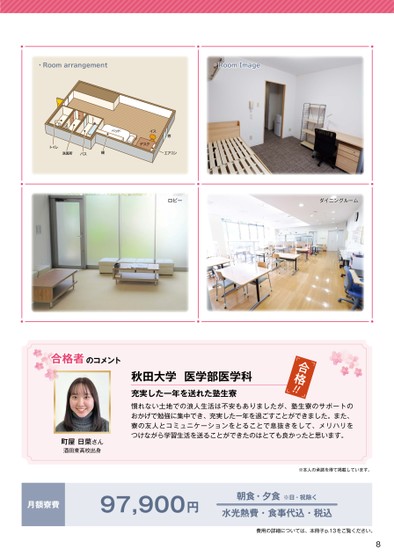・Roomarrangement・RoomImageロビーダイニングルーム合格!!秋田大学医学部医学科充実した一年を送れた塾生寮慣れない土地での浪人生活は不安もありましたが、塾生寮のサポートのおかげで勉強に集中でき、充実した一年を過ごすことができました。また、寮の友人とコミュニケーションをとることで息抜きをして、メリハリをつけながら学習生活を送ることができたのはとても良かったと思います。合格者のコメント町屋日菜さん酒田東高校出身月額寮費97,900円朝食・夕食※日・祝除く水光熱費・食事代込・税込※本人の承諾を得て掲載しています。費用の詳細については、本冊子p.13をご覧ください。8