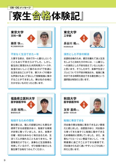 不安なく生活できた一年入寮する前は、初めての一人暮らしということもあり不安だらけでした。しかし、衛生的に管理された共同利用スペースや、食堂のおいしいご飯のおかげで快適に生活を送ることができ、寮スタッフの暖かな声掛けもあって安心して受験勉強に集中することができました。寮は私の合格に欠かせないものだったと思います。漠然とした不安の解消志望校合格のため、親元を離れて浪人生活をしようと決めた方の中には、一人暮らしへの漠然とした不安を抱えている人も多いと思います。そうした中で、食事や生活リズムについての不安が解消され、勉強に集中ができる時間を捻出できる塾生寮という選択肢は有効だと思います。合格東北大学工学部長谷川颯さん秋田高校出身合格東京大学文科一類藤原快さん県立福島高校出身勉強するための環境塾生寮には、個人の部屋以外にも寮生が使用できる自習室があり、勉強する環境が非常に整っていました。また、食事が日曜・祝日も休みなく毎日出るため、生活リズムが崩れることもありません。学習環境だけでなく、食事など生活環境も充実しているので、ぜひ後輩の皆さんも塾生寮で合格をつかんでください。勉強に専念できる河合塾の寮は勉強に専念できるよい環境だと感じました。自習室があり、河合塾から帰ってきた後すぐに勉強に集中できるため積極的に使用していました。また、食事もバリエーション豊富でおいしく、一年間健康に過ごすことができる環境です。河合塾からも近く通いやすいところも良い所だと思います。合格秋田大学医学部医学科友安基舜さん盛岡第一高校出身合格福島県立医科大学医学部医学科太田旭飛さん磐城高校出身9OB・OGメッセージ『寮生合格合格体験記』