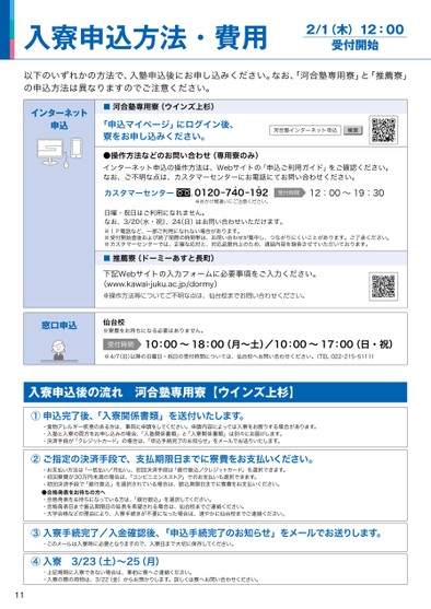 入寮申込方法・費用2/1(木)12:00受付開始以下のいずれかの方法で、入塾申込後にお申し込みください。なお、「河合塾専用寮」と「推薦寮」の申込方法は異なりますのでご注意ください。インターネット申込■河合塾専用寮(ウインズ上杉)「申込マイページ」にログイン後、寮をお申し込みください。河合塾インターネット申込●操作方法などのお問い合わせ(専用寮のみ)インターネット申込の操作方法は、Webサイトの「申込ご利用ガイド」をご確認ください。なお、ご不明な点は、カスタマーセンターにお電話にてお問い合わせください。カスタマーセンター0120-740-194212:00~19:30受付時間Ⓡ4※おかけ間違いにご注意ください。日曜・祝日はご利用になれません。なお、3/20(水・祝)、24(日)はお問い合わせいただけます。※ⅠP電話など、一部ご利用になれない場合があります。※受付開始直後および終了間際の時間帯は、お問い合わせが集中し、つながりにくいことがあります。ご了承ください。※カスタマーセンターでは、正確な応対と、対応品質向上のため、通話内容を録音させていただいております。■推薦寮(ドーミーあすと長町)下記Webサイトの入力フォームに必要事項をご入力ください。(www.kawai-juku.ac.jp/dormy)※操作方法等についてご不明な点は、仙台校までお問い合わせください。窓口申込仙台校※寮費をお持ちになる必要はありません。受付時間10:00〜18:00(月〜土)/10:00〜17:00(日・祝)※4/7(日)以降の日曜日・祝日の受付時間については、仙台校へお問い合わせください。(TEL022-215-5111)入寮申込後の流れ河合塾専用寮【ウインズ上杉】①申込完了後、「入寮関係書類」を送付いたします。・食物アレルギー疾患のある方は、事前に申請をしてください。申請内容によっては入寮をお断りする場合があります。・入塾と入寮の両方をお申し込みの場合、「入塾関係書類」と「入寮関係書類」は別々にお届けします。・決済手段が「クレジットカード」の場合は、「申込手続完了のお知らせ」をメールでお送りいたします。②ご指定の決済手段で、支払期限日までに寮費をお支払いください。・お支払い方法は「一括払い/月払い」、初回決済手段は「銀行振込/クレジットカード」を選択できます。・初回寮費が30万円未満の場合は、「コンビニエンスストア」でのお支払いも選択できます。・初回決済手段で「銀行振込」を選択されている場合は、振込期限日までに寮費をお支払いください。●合格発表をお待ちの方へ・合格発表をお待ちになっている方は、「銀行振込」を選択してください。・合格発表日まで振込期限日の延長を希望される場合は、仙台校までご連絡ください。・大学合格などの理由により、入寮手続きが不要になった場合は、速やかに仙台校までご連絡ください。11③入寮手続完了/入金確認後、「申込手続完了のお知らせ」をメールでお送りします。・このメールは入寮時に必要となりますので、入寮日まで大切に保存してください。④入寮3/23(土)〜25(月)・上記期間に入寮できない場合は、事前に寮へご連絡ください。・入寮の際の荷物は、3/22(金)からお預かりします。詳しくは寮へお問い合わせください。