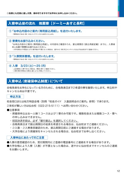 ◎各寮とも定員に達し次第、締め切りますのでお早めにお申し込みください。入寮申込後の流れ推薦寮【ドーミーあすと長町】①「お申込内容のご案内(専用振込用紙)」を送付いたします。・管理会社である(株)共立メンテナンスから送付いたします。②寮費をお振り込みください。「お申込内容のご案内(専用振込用紙)」の内容をご確認のうえ、振込期限日(振込用紙記載)までに、入寮者本人名義で寮費をお振り込みください。・大学合格などの理由により入寮手続が不要になった場合は、速やかに(株)共立メンテナンスおよび仙台校までご連絡ください。③「入寮関係書類」を送付いたします。・管理会社である(株)共立メンテナンスから送付いたします。④入寮3/23(土)〜25(月)・上記期間に入寮できない場合は、事前に寮へご連絡ください。・入寮の際の荷物は入寮日に届くように手配してください。入寮申込(席確保申込制度)について合格発表をお待ちになっている方のために、合格発表日までご希望の寮を確保いたします。申込料やキャンセル料は不要です。申込方法校舎窓口または地方特設会場(別冊「校舎ガイド入塾説明会のご案内」参照)で承ります。ご来校が難しい方は仙台校(022-215-5111)へお問い合わせください。●注意事項・席確保申込はお一人様1コースおよび1寮のみ可能です。複数校舎または複数コース・寮への申し込みはできません。・初回決済手段は、必ず「銀行振込」を選択してください。・・・合格発表日まで振込期限日の延長を希望される場合は、仙台校までご連絡ください。ご入塾・ご入寮意思確認のため、振込期限日前にご連絡する場合があります。大学合格により席確保をキャンセルされる場合は、仙台校までお申し出ください。入寮申込にあたってのご注意●入寮の意思確認のため、受付期間内にご登録の電話番号にご連絡をする場合があります。●大学合格により入寮(入塾)が不要となった場合は、速やかに仙台校までキャンセルのご連絡をお願いします。12