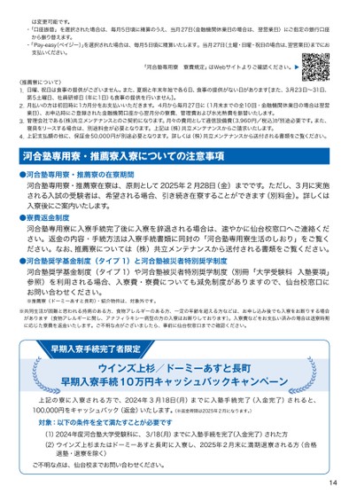 ・「口座振替」を選択された場合は、毎月5日頃に精算のうえ、当月27日(金融機関休業日の場合は、翌営業日)にご指定の銀行口座・「Pay-easyペイジー)」を選択された場合は、毎月5日頃に精算いたします。当月27日(土曜・日曜・祝日の場合は、翌営業日)までにおは変更可能です。から振り替えます。支払いください。「河合塾専用寮寮費規定」はWebサイトよりご確認ください。▼〈推薦寮について〉1.日曜、祝日は食事の提供がございません。また、夏期と年末年始で各6日、食事の提供がない日があります[また、3月23日~31日、第5土曜日、社員研修日(年に1日)も食事の提供を行いません]。2.月払いの方は初回時に1カ月分をお支払いいただきます。4月から毎月27日に(1月末までの全10回・金融機関休業日の場合は翌営業日)、お申込時にご登録された金融機関口座から翌月分の寮費、管理費および水光熱費を振替いたします。3.管理会社である(株)共立メンテナンスとのご契約になります。月々の費用として通信設備費(3,960円/税込)が別途必要です。また、寝具をリースする場合は、別途料金が必要となります。上記は(株)共立メンテナンスからご請求いたします。4.上記支払額の他に、保証金50,000円が別途必要となります。詳しくは(株)共立メンテナンスから送付される書類をご覧ください。河合塾専用寮・推薦寮入寮についての注意事項●河合塾専用寮・推薦寮の在寮期間河合塾専用寮・推薦寮在寮は、原則として2025年2月28日(金)までです。ただし、3月に実施される入試の受験者は、希望される場合、引き続き在寮することができます(別料金)。詳しくは入寮後にご案内いたします。●寮費返金制度河合塾専用寮に入寮手続完了後に入寮を辞退される場合は、速やかに仙台校窓口へご連絡ください。返金の内容・手続方法は入寮手続書類に同封の「河合塾専用寮生活のしおり」をご覧ください。なお、推薦寮については(株)共立メンテナンスから送付される書類をご覧ください。●河合塾奨学基金制度(タイプ1)と河合塾被災者特別奨学制度河合塾奨学基金制度(タイプ1)や河合塾被災者特別奨学制度(別冊「大学受験科入塾要項」参照)を利用される場合、入寮費・寮費についても減免制度がありますので、仙台校窓口にお問い合わせください。※推薦寮(ドーミーあすと長町)・紹介物件は、対象外です。※共同生活が困難と思われる持病のある方、食物アレルギーのある方、一定の年齢を超える方などは、お申し込み後でも入寮をお断りする場合があります(食物アレルギーに関し、アナフィラキシー病型の方の入寮はお断りしております)。入寮費などをお支払い済みの場合は退寮時期に応じた寮費を返金いたします。ご不明な点がございましたら、事前に仙台校窓口までご確認ください。早期入寮手続完了者限定ウインズ上杉/ドーミーあすと長町早期入寮手続10万円キャッシュバックキャンペーン上記の寮に入寮される方で、2024年3月18日(月)までに入塾手続完了(入金完了)されると、100,000円をキャッシュバック(返金)いたします。(※返金時期は2025年2月になります。)対象:以下の条件を全て満たすことが必要です(1)2024年度河合塾大学受験科に、3/18月)までに入塾手続を完了(入金完了)された方(2)ウインズ上杉またはドーミーあすと長町に入寮し、2025年2月末に満期退寮される方(合格退塾・退寮を除く)ご不明な点は、仙台校までお問い合わせください。14