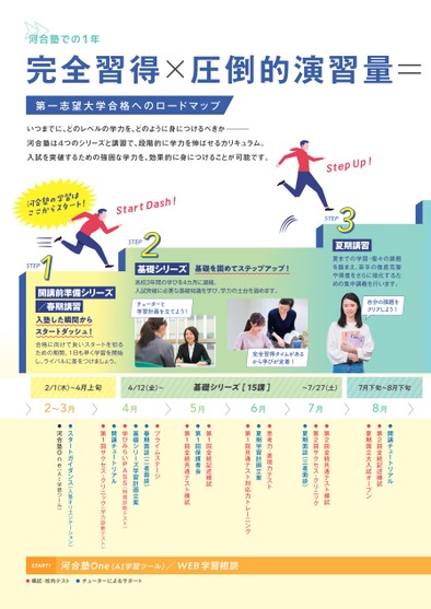 完全習得×圧倒的演習量=第一志望大学合格へのロードマップいつまでに、どのレベルの学力を、どのように身につけるべきか―河合塾は4つのシリーズと講習で、段階的に学力を伸ばせるカリキュラム。入試を突破するための強固な学力を、効果的に身につけることが可能です。STEP22基礎シリーズ基礎を固めてステップアップ!高校3年間の学びを4カ月に凝縮。入試突破に必要な基礎知識を学び、学力の土台を固めます。チューターと学習計画を立てよう!STEP11開講前準備シリーズ/春期講習入塾した瞬間からスタートダッシュ!STEP33夏期講習夏までの学習・個々の課題を踏まえ、苦手の徹底克服や得意をさらに強化するための集中講義を行います。自分の課題をクリアしよう!合格に向けて良いスタートを切るための期間。1日も早く学習を開始し、ライバルに差をつけましょう。完全習得タイムがあるから学びが定着!2/1(木)〜4月上旬4/12(金)〜基礎シリーズ[15講]〜7/27(土)7月下旬〜8月下旬8月●開講チュートリアル●第2回全統記述模試●夏期国立大入試オープン7月●第2回全統共通テスト模試●第2回サクセス・クリニック●夏期面談(三者面談)6月●思考力・表現力テスト●夏期学習計画立案●第1回共通テスト対応力トレーニング5月●第1回全統記述模試●第1回保護者会●第1回全統共通テスト模試●プライムステージ●春期面談(二者面談)●基礎シリーズ学習計画立案●学びみらいPASS(特徴診断テスト)●開講チュートリアル●第1回サクセス・クリニック(学力診断テスト)●スタートガイダンス(入塾オリエンテーション)●河合塾One(A学習ツール)2〜3月4月START!河合塾One(A学習ツール)/WEB学習相談詳細は模試・校内テストチューターによるサポート