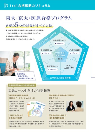 述対策述・論い記本番さページへプレミアム講義12添削指導システム12ページへ学問の本質・原理の理解授業度の高精習演問良実戦演習タイム3ペ1ージへ国立大入試オープンながらの実戦演習完全習得タムイ15ページへ厳選された発展演習東大・京大・医進合格プログラム必要な5つの対策がすべて完結!東大・京大・医学部合格のために必要な5つの対策を、バランスよく確実にマスターできる特別プログラム。河合塾なら、圧倒的な演習量で、合格に必要なすべての力が身につきます。るえ鍛を力点得添削答案を講師が確認し、映します。次の授業に反大学別の入試傾向対策医学部医学科特有の入試対策も充実!医進コース生だけの特別指導医学部医学科志望者必見「医学科データブックVol.1〜3」面接指導や志望理由書の添削など万全のサポート最新の医学科入試情報と分析データ、学習アドバイスや面接・小論文対策レポートなど、必読の情報が満載です。多様な形式に対応「医系小論文」前年までのデータベースを基に、志望大学の形式にあわせて模擬面接を実施。志望理由書の添削指導も行います。医学部の情報に触れる「医進特別講座」医学科の小論文は、形式・テーマともに多種多様。答案を作成後、次の講で添削答案を手に講義を受け、継続的に論述力を磨きます。面接や小論文などで問われる医療問題・トピックスを学べる特別映像コンテンツです。医療の現状と課題など、理解と考察を深めます。