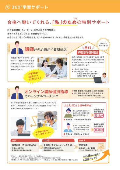 合格へ導いてくれる、「私」のための特別サポート河合塾の講師・チューターは、大学入試の専門知識と指導スキルを身につけた「受験指導のプロ」。自分では気づきにくい可能性を、プロの視点からアドバイスし、目標達成へと導きます。講師がきめ細かく質問対応講師室は質問しやすいオープンスペース。授業の疑問や学習の進め方など、いつでも気軽に相談可能。その日のうちに疑問を解決できます。自宅でも質問できる!WEB学習相談対応するのはすべてプロの講師やフェロー(質問対応専門講師)。オンラインで気軽に質問できます。自習中の疑問点や学習の進め方の相談はもちろん、添削も行います。●1回30分(事前予約制)●科目:英語・数学・現代文・古文・漢文・小論文・物理・化学・生物・地学・日本史・世界史・地理・公民オンライン講師個別指導でパーソナルコーチング●時間・回数:各科目週1回45分(年間35回)●科目:英語・数学・現代文・古文・物理・化学・生物・日本史・世界史・地理・公民※1科目から受講可キミの学習を最適解へ導く、1対1のパーソナルコーチング。事前にご希望を伺い、キミにピッタリな講師をマッチングし、専属の講師が個別指導を行います。STEP2STEP1たとえばこんな悩みを解決!苦手な分野で得点できない。徹底的に苦手分野を克服するための対策がしたい!■志望大学:千葉大学医学部医学科授業がきちんと理解できているか心配。予習・復習を中心に、疑問点を解決したい!■志望大学:早稲田大学教育学部全統記述模試数学偏差値13.8UP全統記述模試英語偏差値16.0UPSTEP3希望のコースをお申し込み科目により早めに定員締切になる場合があります。受講ガイダンス(オンライン)を予約志望や学習状況に応じて、最適な講師をマッチングします。初回受講初回はスタッフが受講をサポートするので安心です。※「オンライン講師個別指導プラスコース」で受講できます。その他のコースも、オプション講座として「オンライン講師個別指導」を追加できます。※受講ガイダンスの予約方法は、別途ご案内します。※完成シリーズに、担当講師が変更になる場合があります。TEACHERTEACHER