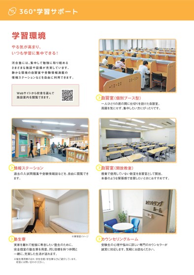 やる気が高まり、いつも学習に集中できる!河合塾には、集中して勉強に取り組めるさまざまな施設や設備が充実しています。静かな環境の自習室や受験情報満載の情報ステーションなどを自由に利用できます。Webサイトから校舎を選んで施設案内を閲覧できます。自習室(個別ブース型)一人ひとりの席の間に仕切りを設けた自習室。周囲を気にせず、集中したい方にぴったりです。情報ステーション過去の入試問題集や受験情報誌などを、自由に閲覧できます。自習室(開放教室)授業で使用していない教室を自習室として開放。本番のような緊張感で自習したいときにおすすめです。※寮個室イメージ塾生寮実家を離れて勉強に専念したい塾生のために、完全個室の塾生寮を用意。同じ目標を持つ仲間と一緒に、充実した生活が送れます。※塾生専用寮のほか、学生会館・学生寮などもご紹介しています。校舎にお問い合わせください。カウンセリングルーム受験生の心理や悩みに詳しい専門のカウンセラーが誠実に対応します。気軽にお訪ねください。