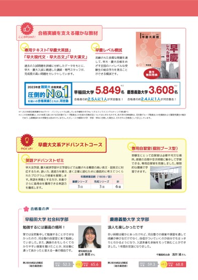 POINT!2023年度難関大合格実績圧倒的桁違いの合格実績!これが、河合塾早稲田大学5,849名合格者の約2.5人に1人が河合塾生!3,608慶應義塾大学名合格者の約2.4人に1人が河合塾生!PICKUP!52.3+13.365.659.3+9.568.8