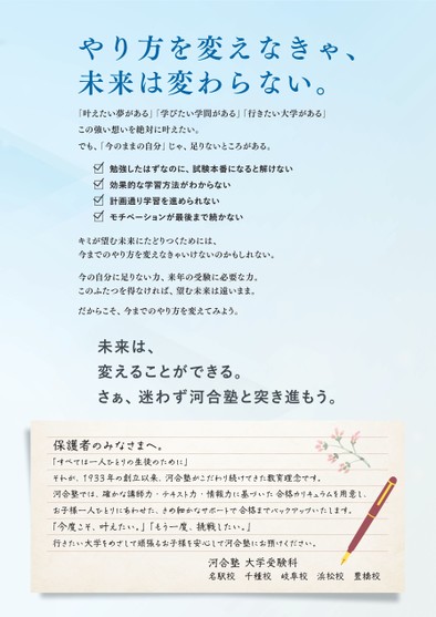 東海地区の大学受験科のデジタルカタログ。コース案内や申込方法、授業料など、大学受験科に関する情報をお届けします。大学受験の予備校、学校法人河合塾の公式サイトをご利用ください。